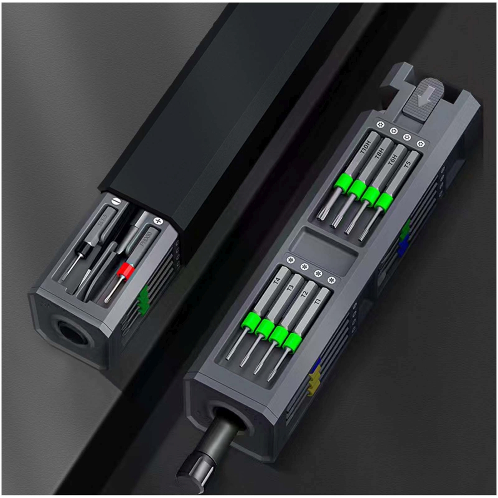 30dílná sada přesných šroubováků s 28 bity a dvěma doplňky. Pouzdro z oxidovaného hliníku (15 x 3,6 x 3,6 cm) lze personalizovat vyrytým logem. Kompaktní pouzdro usnadňuje uložení všeho na jednom místě. Ruční šroubovák je ideální pro opravu jakéhokoli malého zařízení a díky svému tvaru se snadno používá i ovládá. Je vybaven širokou škálou bitů, takže je univerzální pro mnoho typů kutilských činností. Každý typ bitu je označen jinou barvou, aby jej bylo možné snadno identifikovat. Bity jsou magneticky přitaženy ke šroubováku. Součástí sady je také pinzeta na vybírání drobných předmětů a páčidlo na zvedání a otevírání pouzder. Baleno v dárkové krabičce (17 × 55 × 43,5 cm) s magnetickým uzávěrem. Rozměry: 15 x 3,6 x 3,6 cm