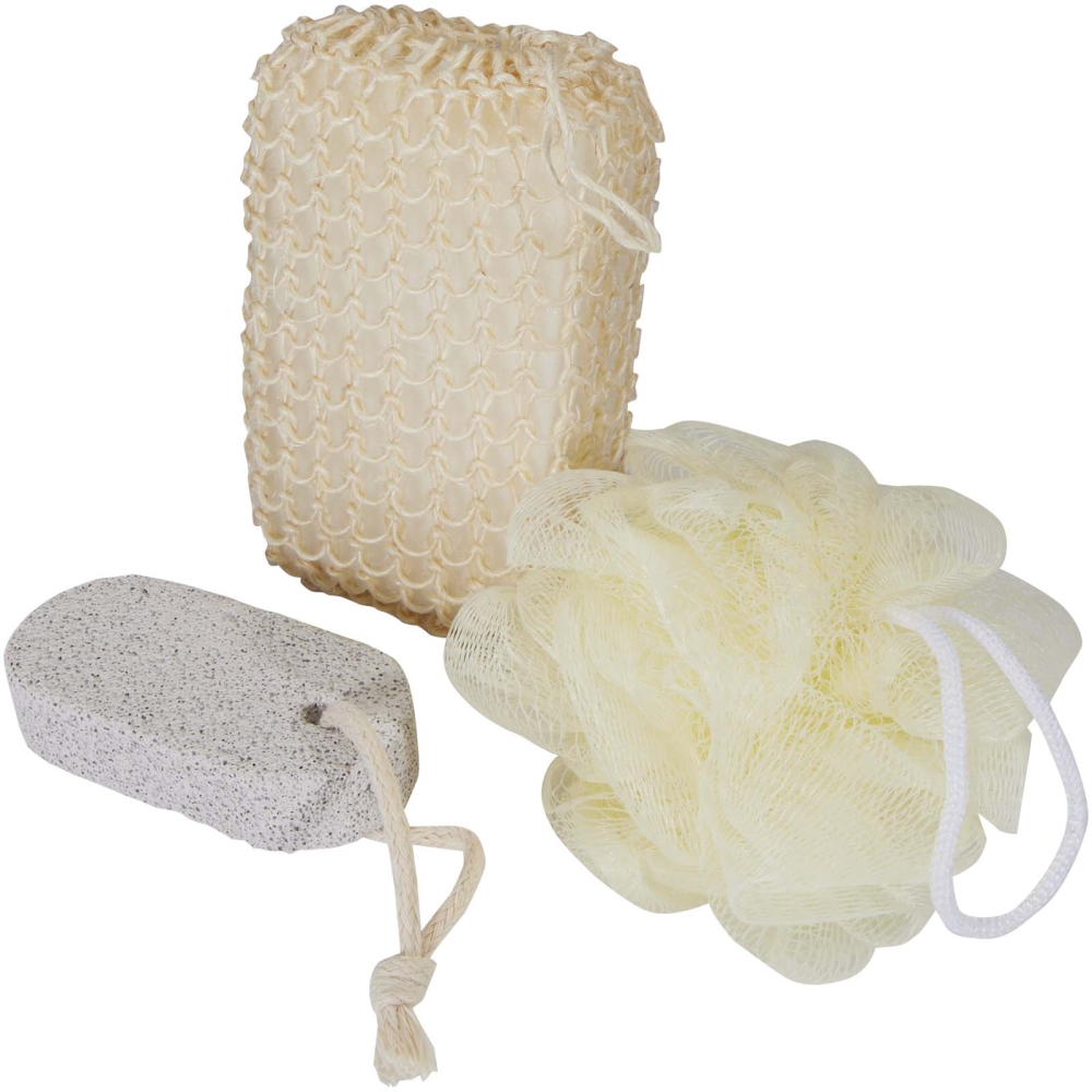 3dílná sada koupelnových doplňků obsahující kouli do koupele / lufu, pemzu a houbu ze sisalového konopí. Velikost koule do koupele / lufy: 9 cm. Velikost pemzy: 9,5 × 4,5 × 1,5 cm. Velikost konopné houby: 14 × 8 × 5 cm. Dodáváno v sáčku z polyesteru. Rozměry: 22 x 19,5 cm