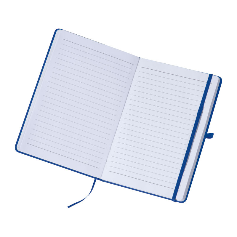 A5 linkovaný poznámkový blok se 160 stranami (80 listů), pevným PU obalem, černou záložkou a gumičkou na zavírání. Rozměry: 14 x 21 x 1,3 cm
