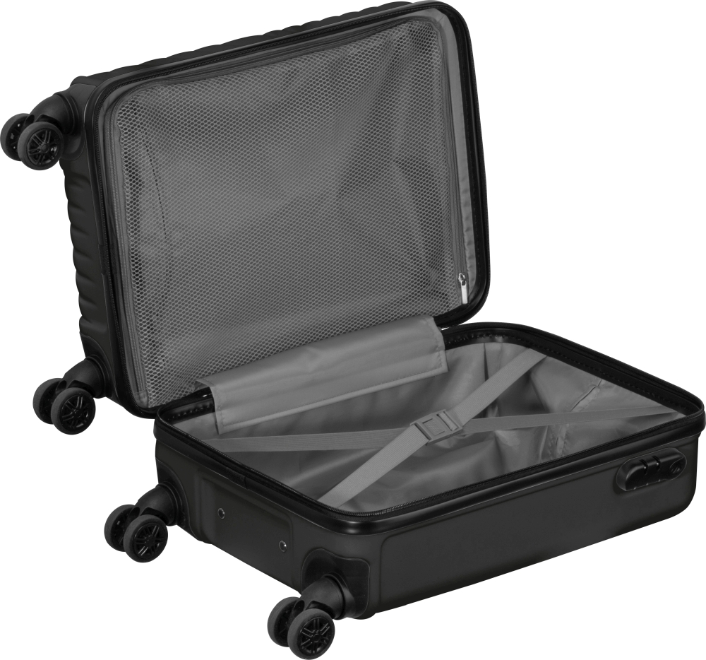 ABS vozík s matnými černými koly a matným povrchem. Velikosti příručního zavazadla. Rozměry: