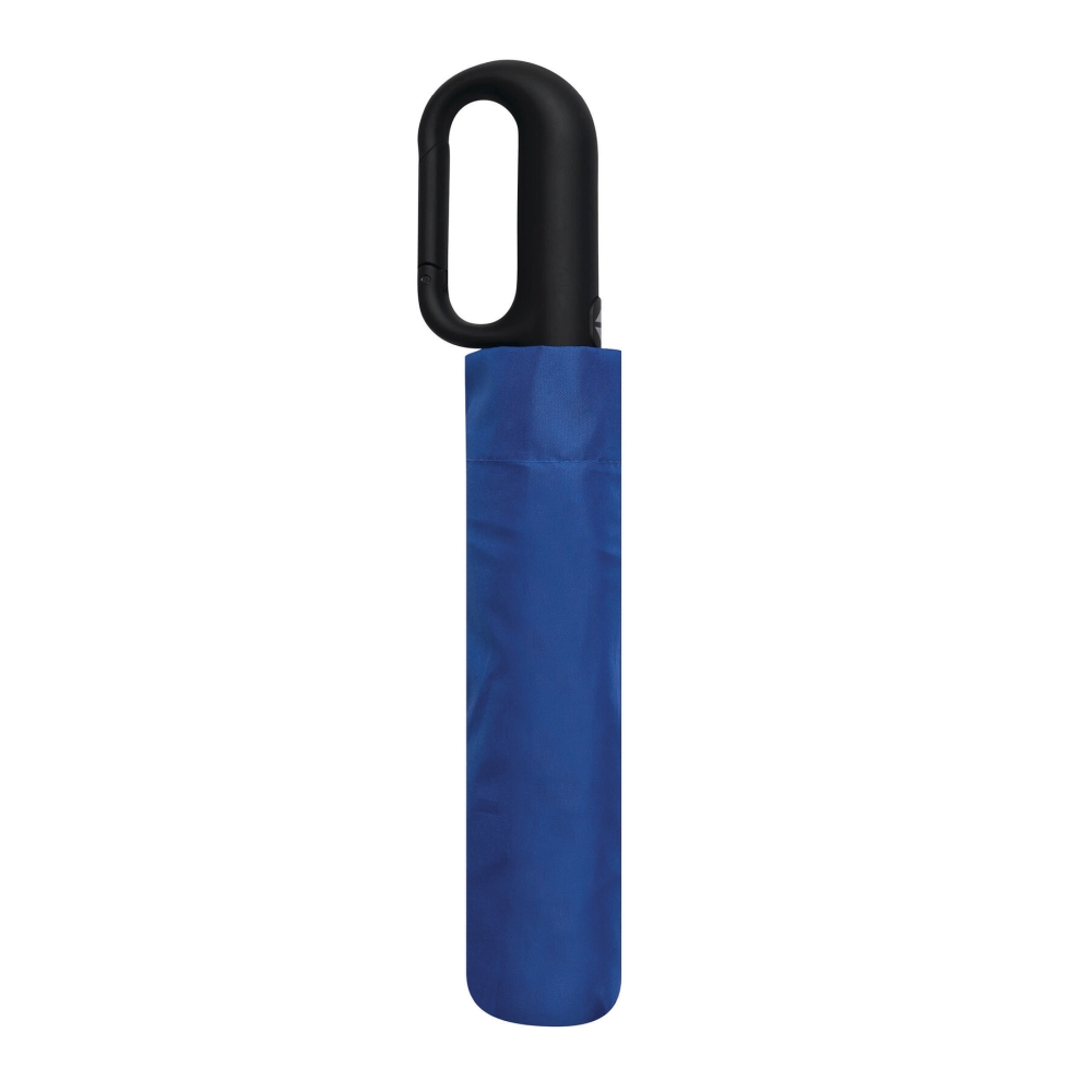 Automatický větruodolný kapesní deštník s pouzdrem. Třídílná kovová tyč s kovovými/sklolaminátovými žebry a kovovými koncovkami, pogumovaná karabina, stříška z polyesterové pongee z recyklovaného plastu, zapínání na suchý zip. Rozměry: O98 / 33-60 cm
