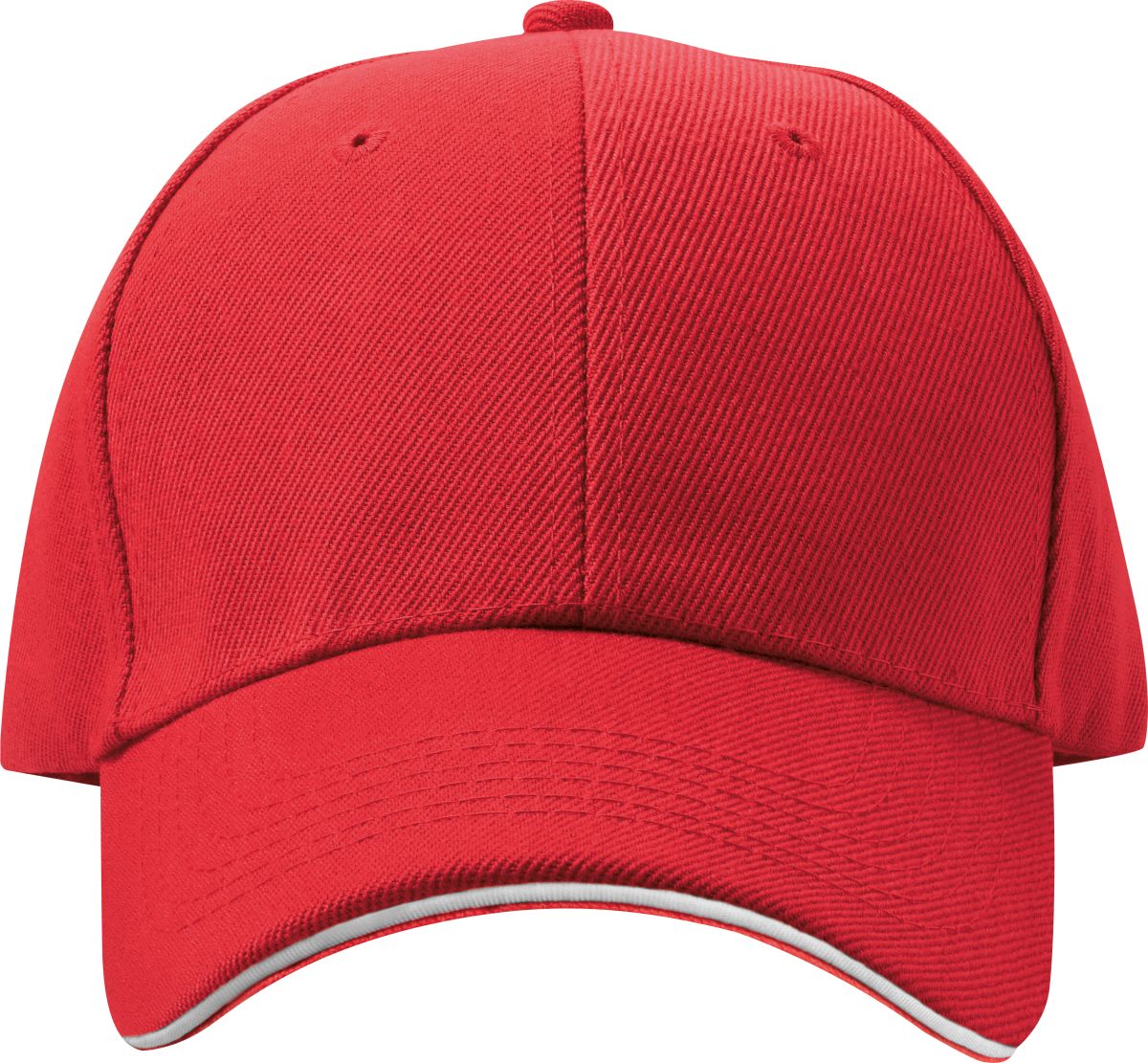 Šestipanelová baseballová čepice z česané bavlny s bílým proužkem na kšiltu a kovovým zapínáním, neobsahuje AZO prvky. Červená barva.