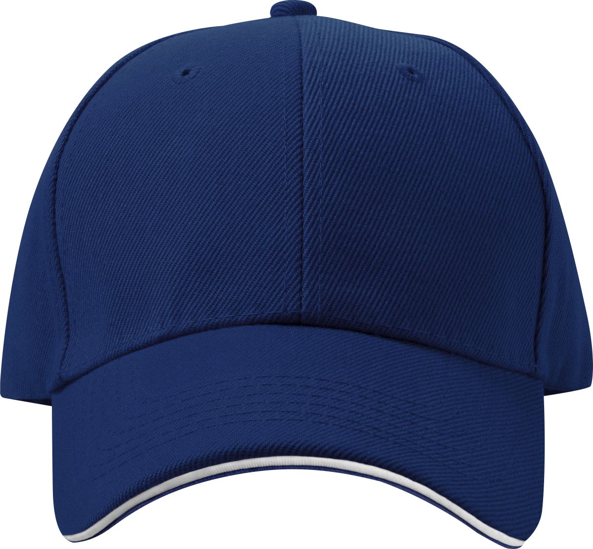 Šestipanelová baseballová čepice z česané bavlny s bílým proužkem na kšiltu a kovovým zapínáním, neobsahuje AZO prvky. Námořnická modrá barva.