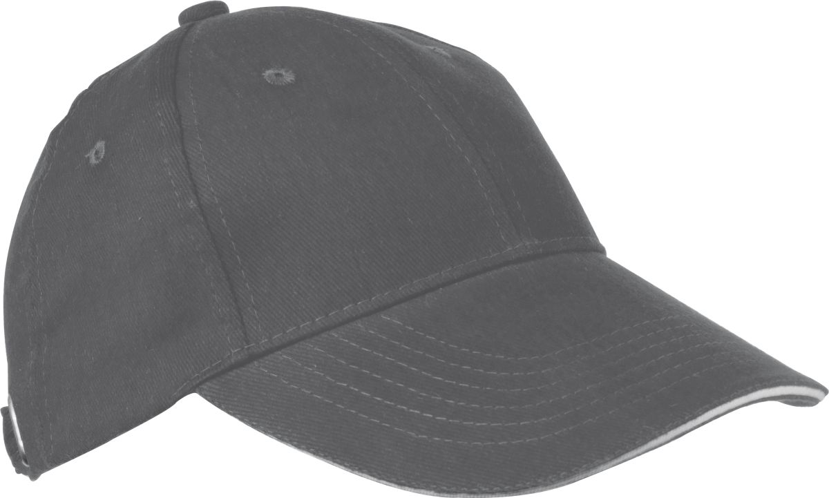 Šestipanelová baseballová čepice z česané bavlny s bílým proužkem na kšiltu a kovovým zapínáním, neobsahuje AZO prvky. Stříbrná barva.