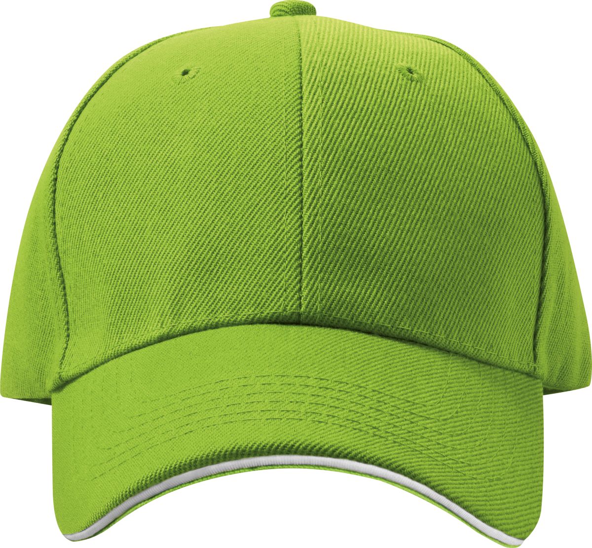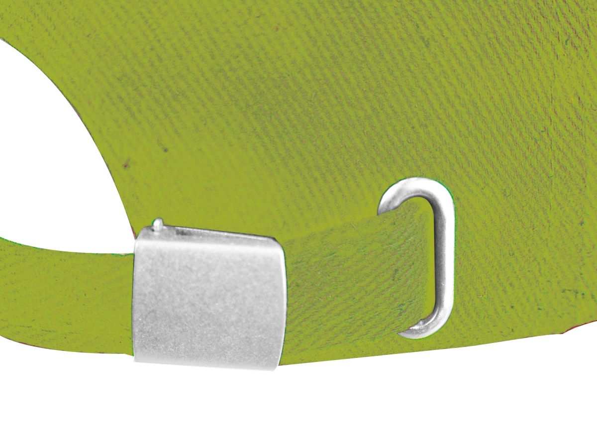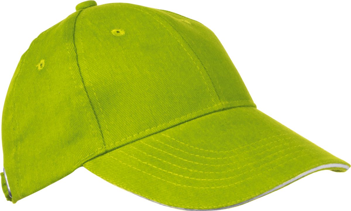 Šestipanelová baseballová čepice z česané bavlny s bílým proužkem na kšiltu a kovovým zapínáním, neobsahuje AZO prvky. Světle zelená barva.