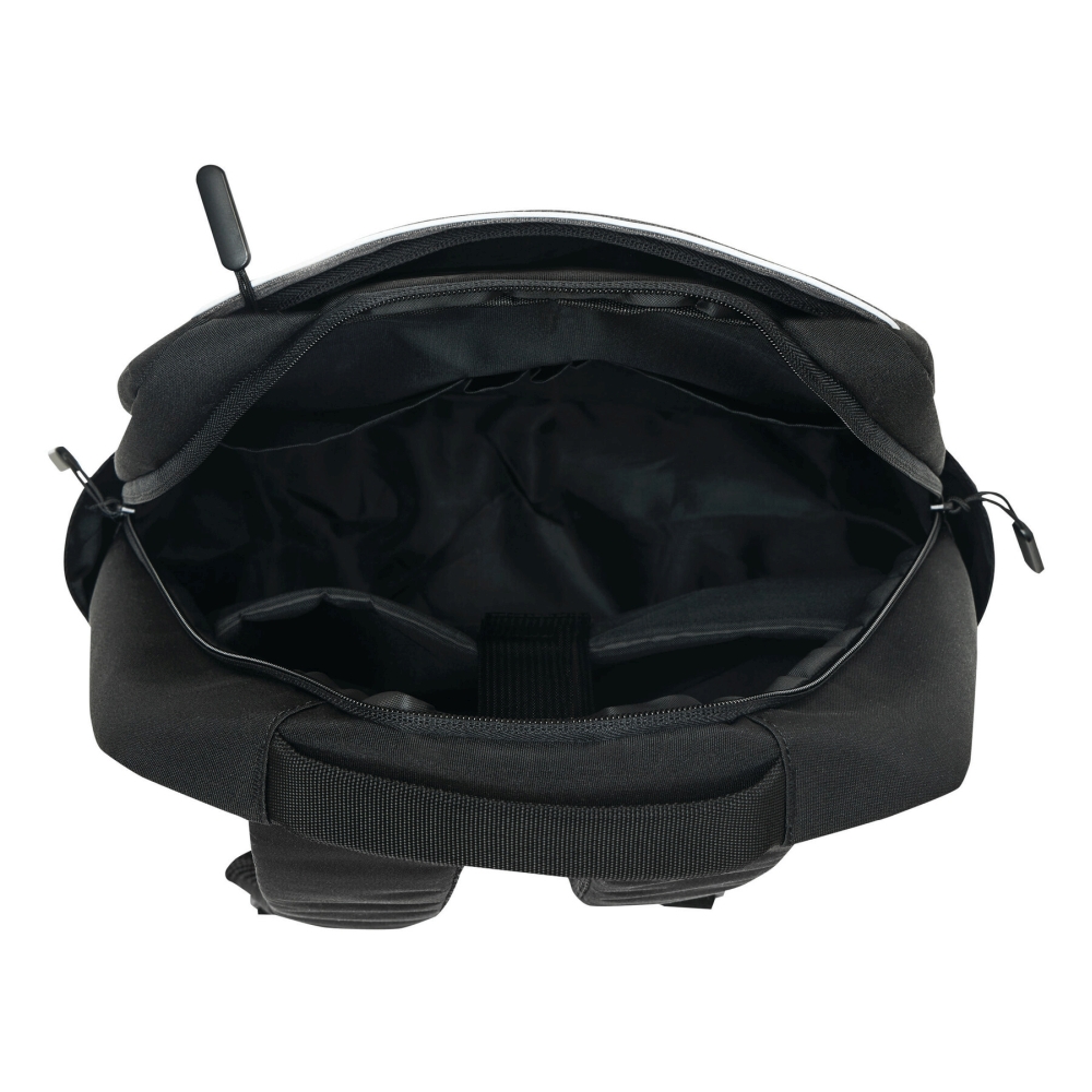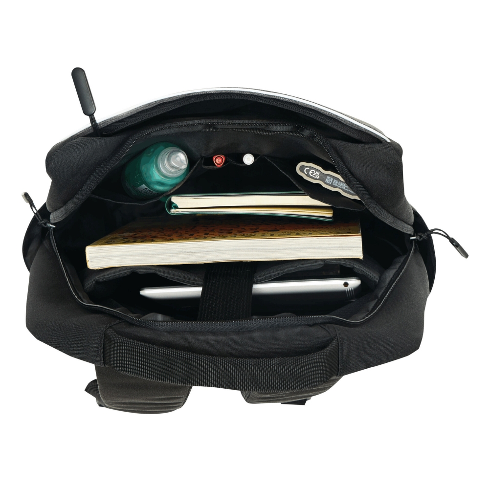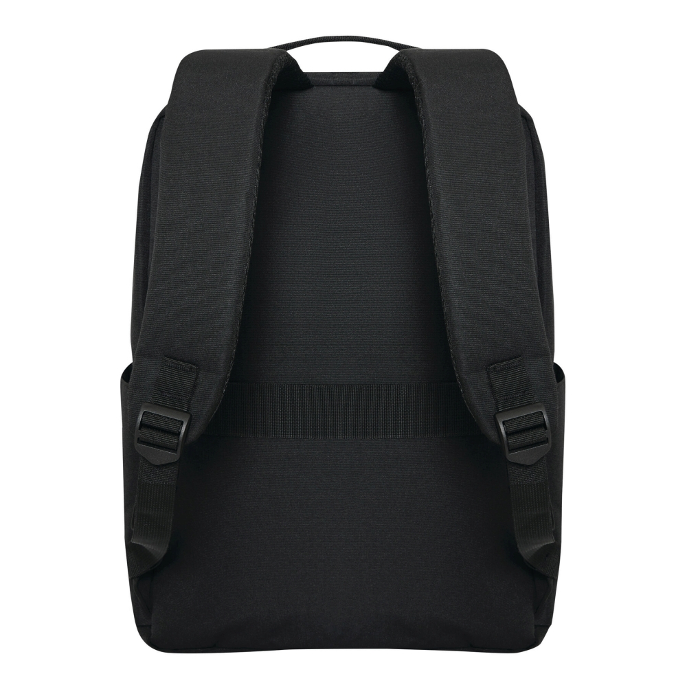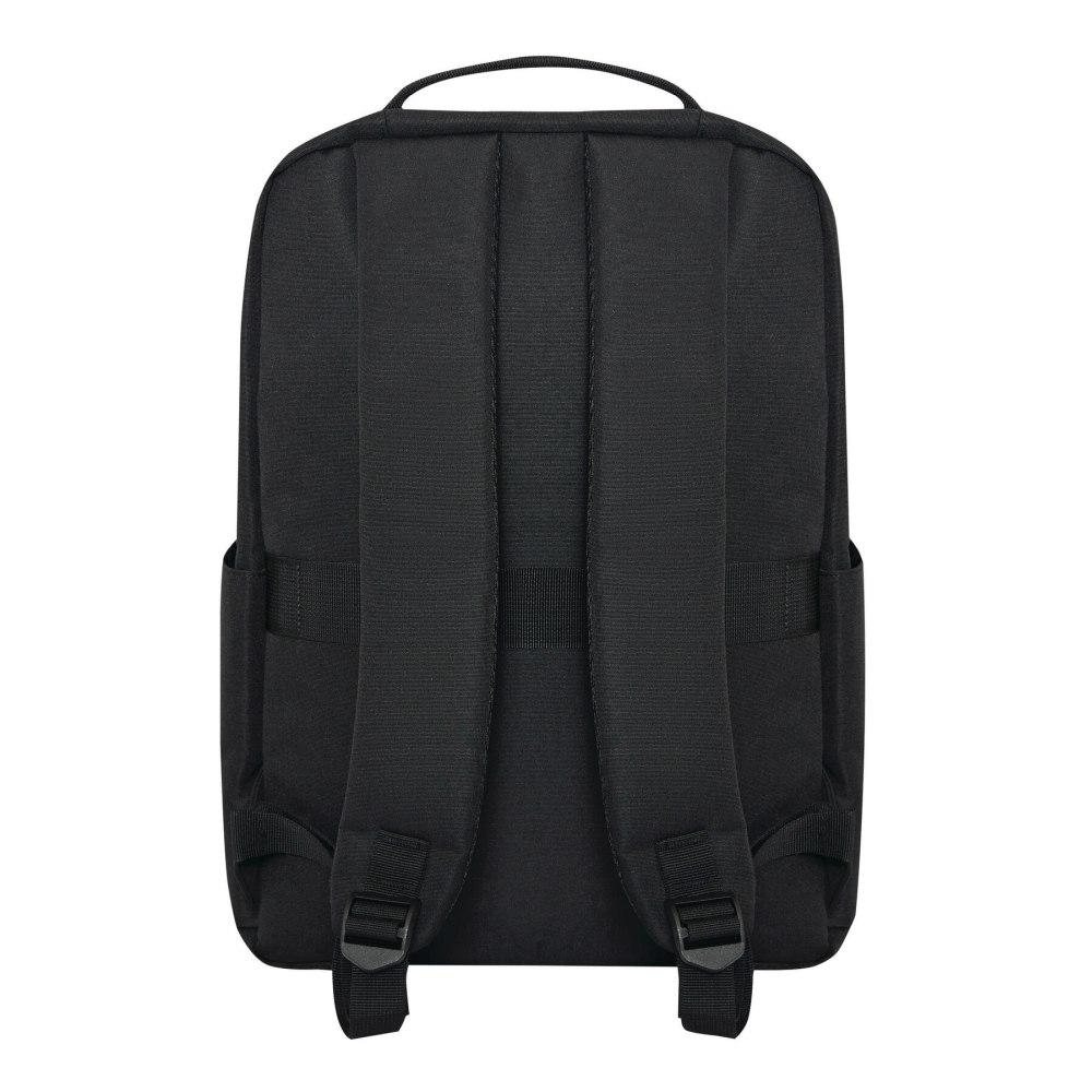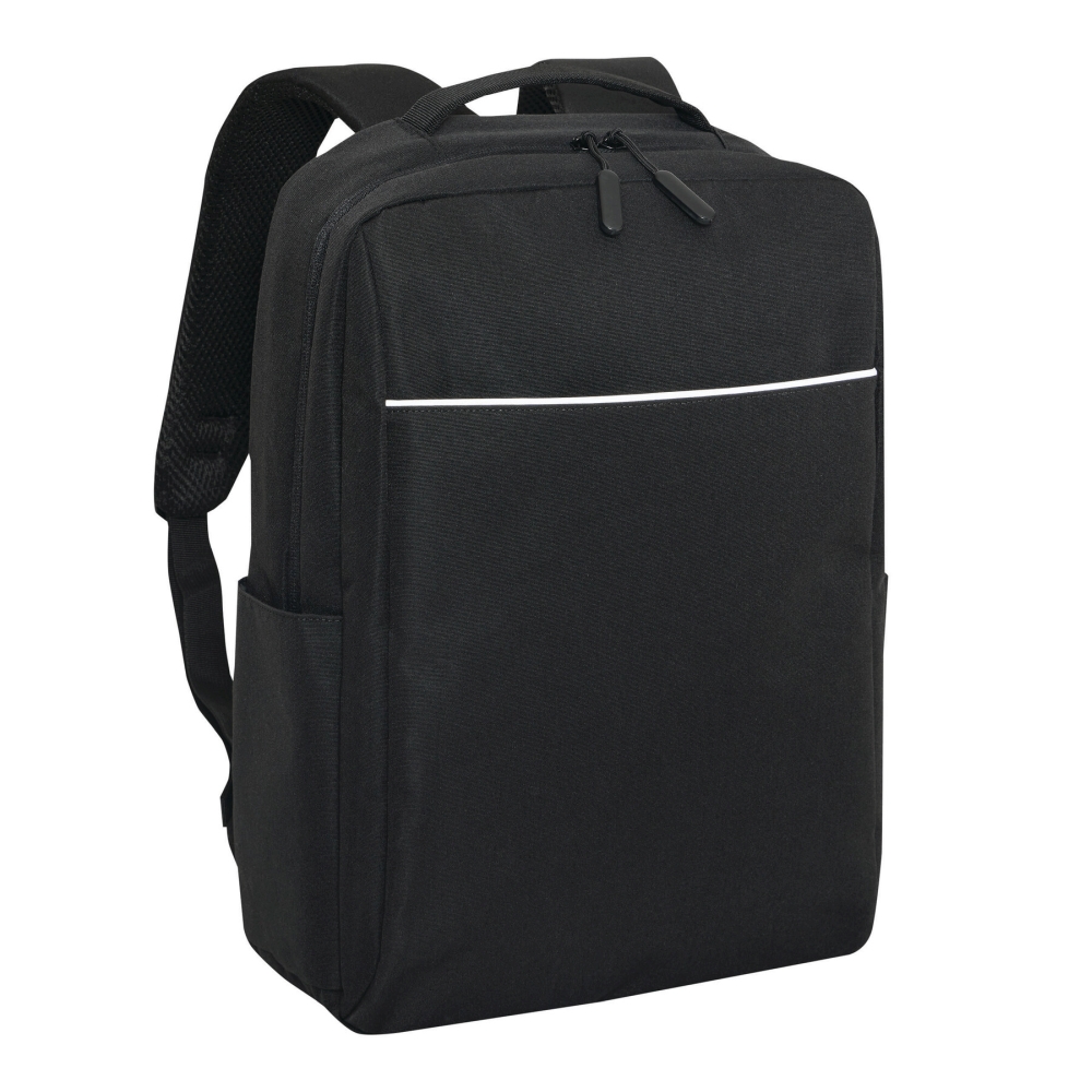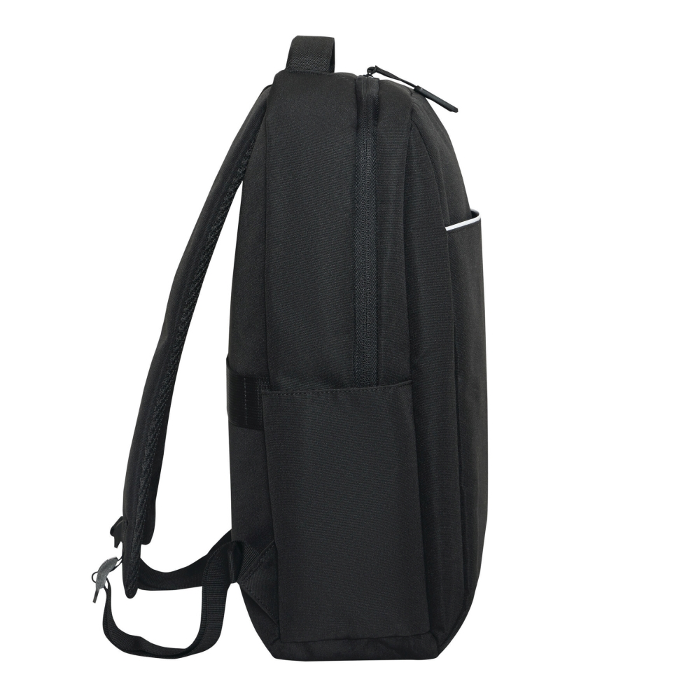 Batoh z recyklovaného polyesteru, 1 přední kapsa na zip s reflexním proužkem, hlavní přihrádka na zip s polstrovanou vnitřní přihrádkou na notebook nebo tablet, organizér se 4 vsuvnými kapsami, 2 boční vsuvné kapsy, polstrované madlo, polstrované a nastavitelné ramenní popruhy, popruh k upevnění na kufr. Rozměry: 41 x 11 x 28 cm