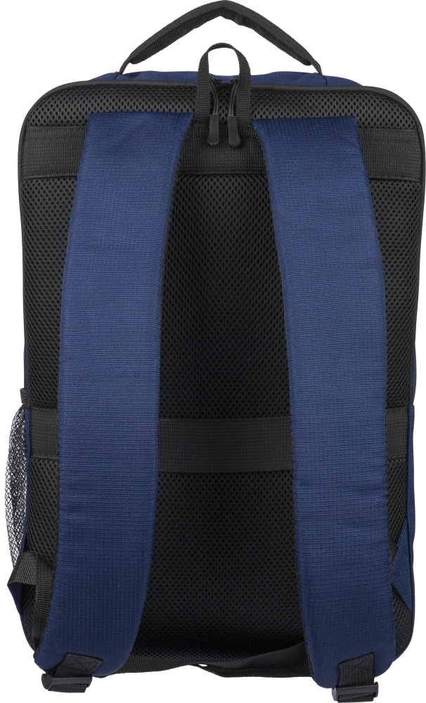 Batoh z rPET 300D vyrobený z recyklovaného oceánského plastu s odolnou texturovanou povrchovou úpravou. Objem 20 l se dvěma velkými přihrádkami na zip, polstrovanou přihrádkou na 15" notebook, dvěma předními kapsami, boční síťovanou kapsou a horním poutkem. Vybaven odvětrávanými ramenními popruhy, polstrovanými zády, popruhem na kolečkách. Rozměry: 43 cm x 30 cm