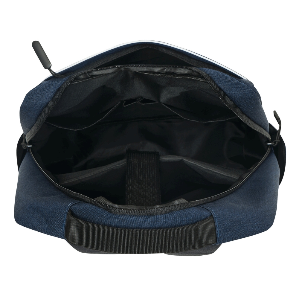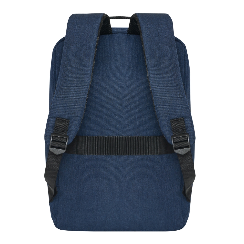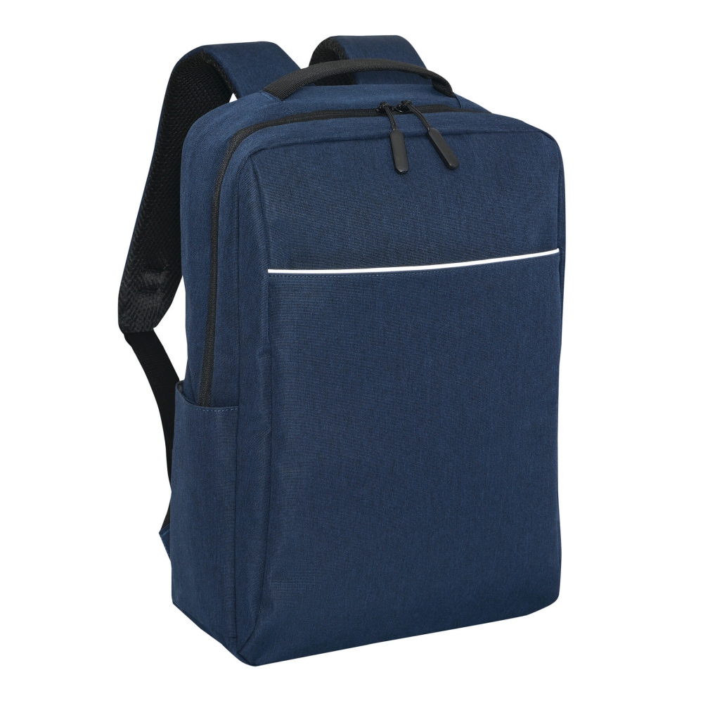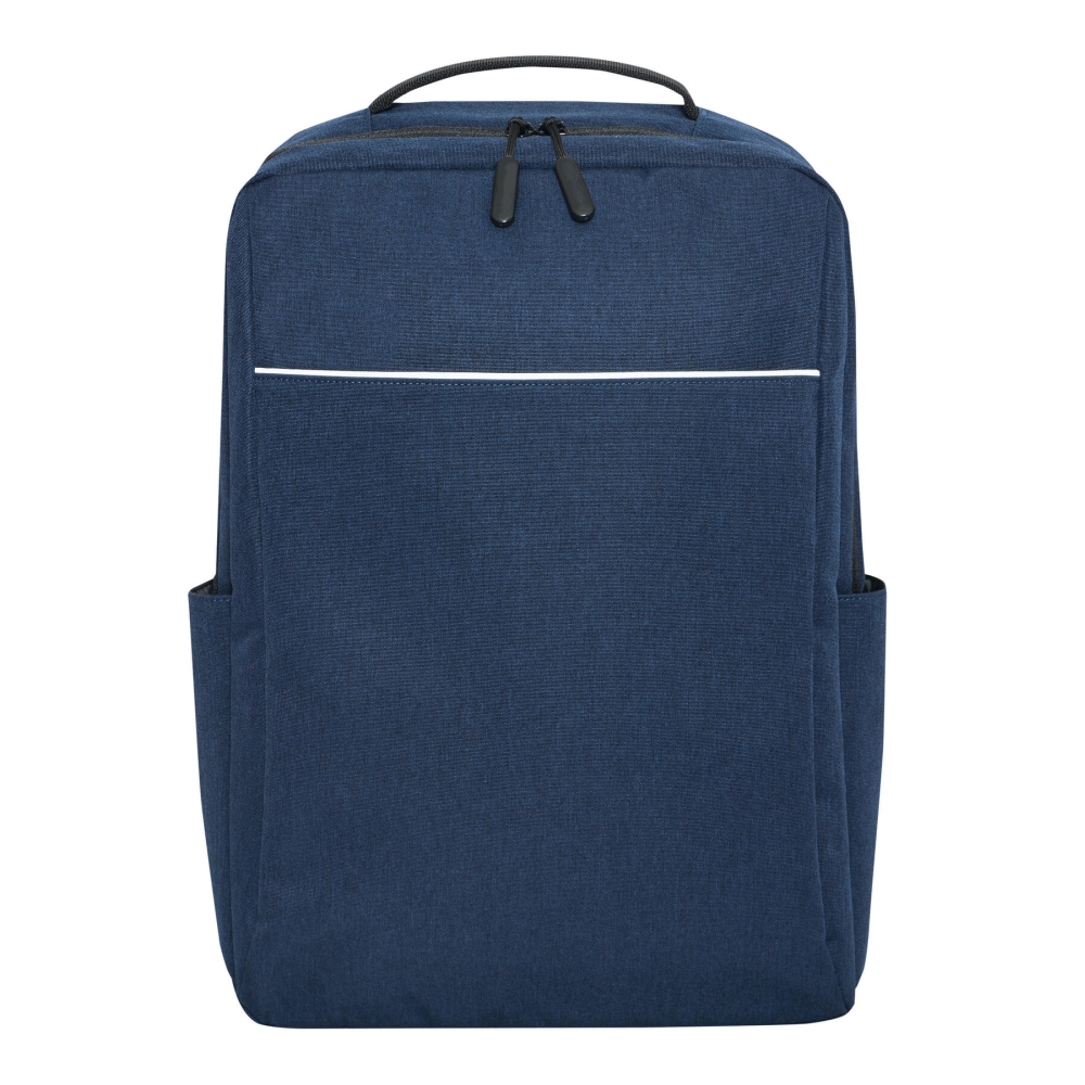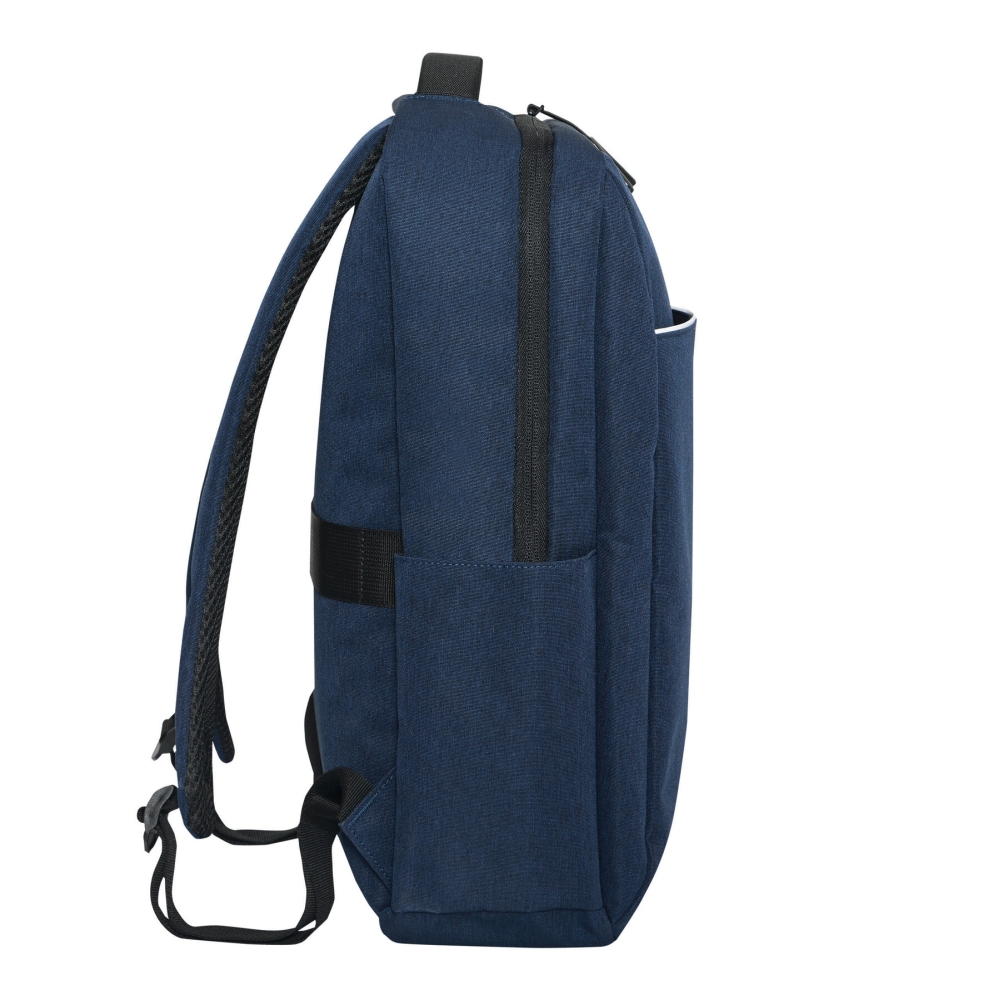 Batoh z recyklovaného polyesteru, 1 přední kapsa na zip s reflexním proužkem, hlavní přihrádka na zip s polstrovanou vnitřní přihrádkou na notebook nebo tablet, organizér se 4 vsuvnými kapsami, 2 boční vsuvné kapsy, polstrované madlo, polstrované a nastavitelné ramenní popruhy, popruh k upevnění na kufr. Rozměry: 41 x 11 x 28 cm