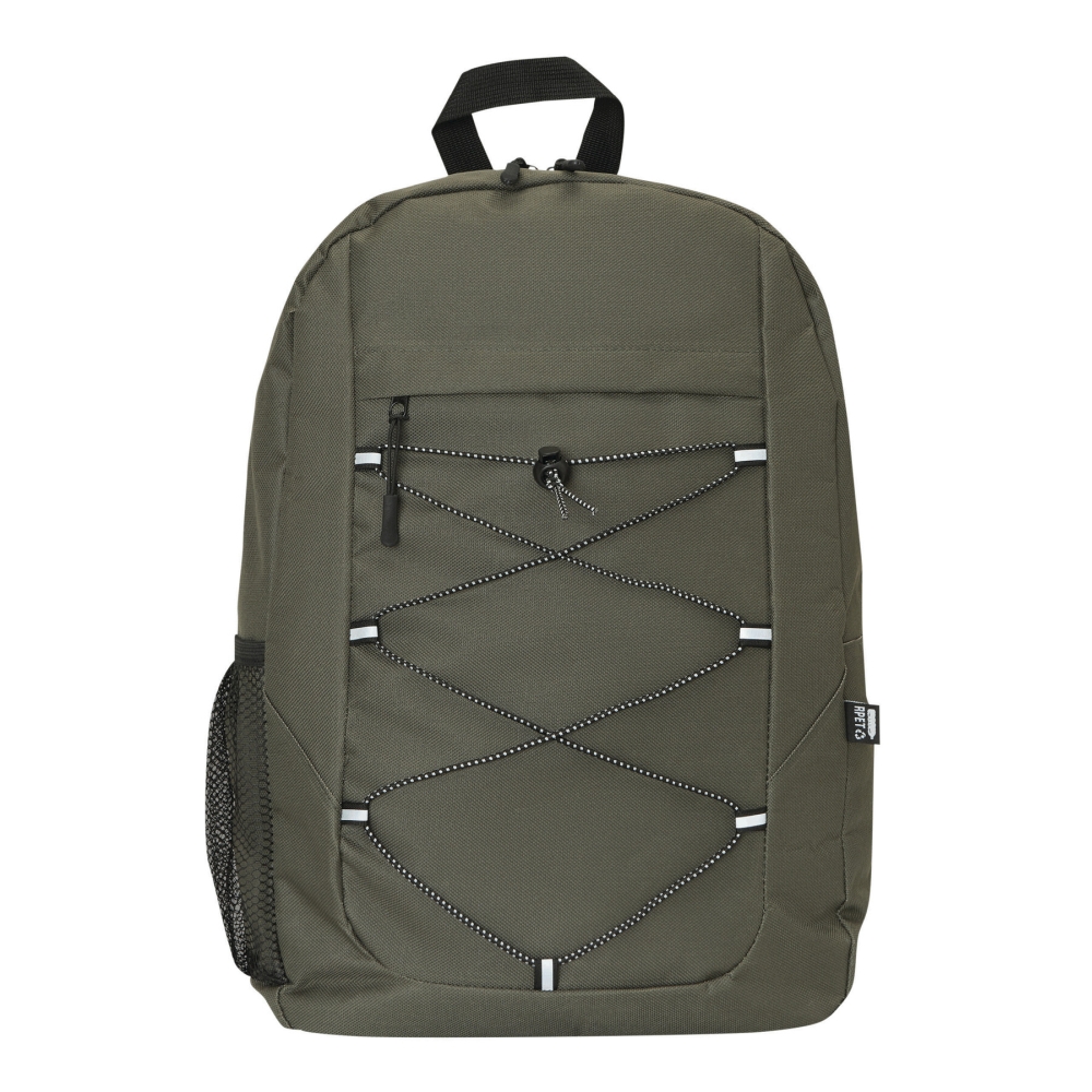 Batoh z recyklovaného polyesteru, hlavní kapsa na zip, přední kapsa na zip s nastavitelnou elastickou stahovací šňůrkou, poutko na nošení, 1 boční síťovaná kapsa, polstrované dno, nastavitelné polstrované ramenní popruhy. Rozměry: 30 x 15 x 43 cm