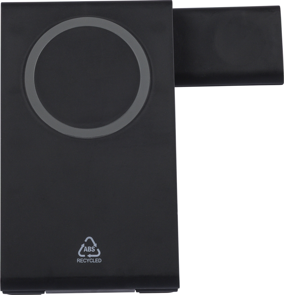 Magnetická nabíječka 3 v 1 z recyklovaného ABS plastu pro telefon (15 W), AirPods (5 W) a iWatch (2 W). Ultra plochá se skládacím stojánkem. Vstup: 5 V/3 A nebo 9 V/3 A. Recyklované logo. Baleno v hnědé krabičce. Rozměry: 2,22 cm x 12,7 cm