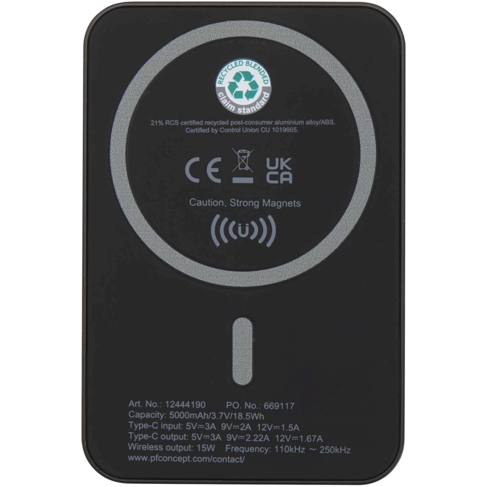 Bezdrátová magnetická powerbanka 5000 mAh 15W s 20W PD – vyrobeno z recyklovaného plastu, černá