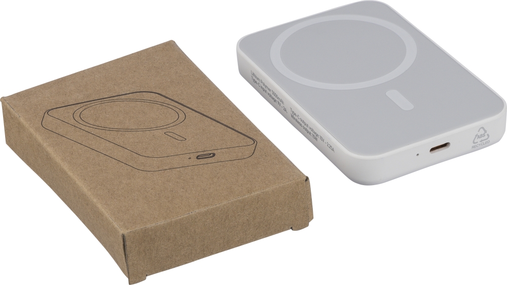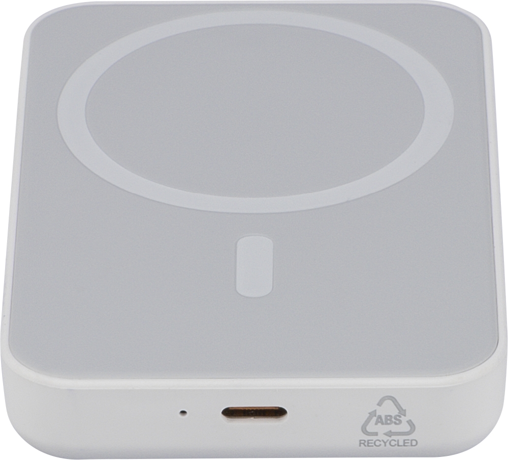 Bezdrátová nabíječka z recyklovaného ABS plastu (5 000 mAh). 15W bezdrátové nabíjení kompatibilní s MagSafe. Vstup/výstup typu C, bezpečnostní ochrany, automatické vypnutí. Součástí balení je kovový kroužek pro zařízení bez MagSafe. Logo z recyklovaného ABS plastu na boku. Baleno v hnědé krabičce s hedvábným papírem. Rozměry: 1,5 cm x 9,7 cm
