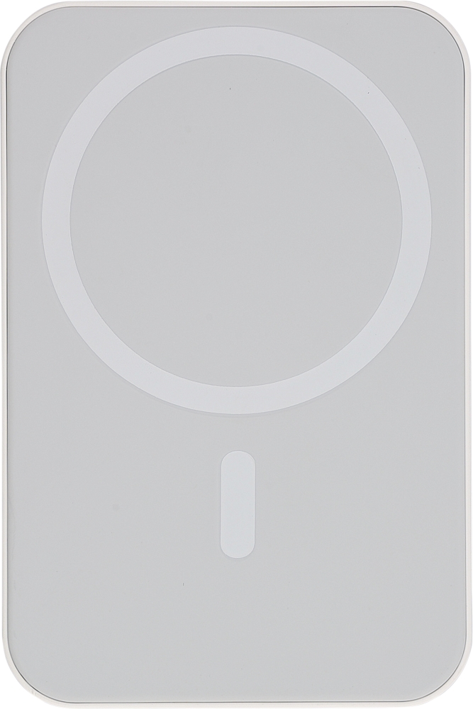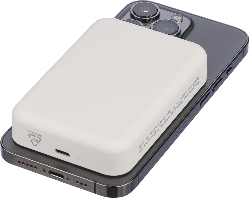 Bezdrátová nabíječka s recyklovaným konektorem powerbanka s velkou baterií 10 000 mAh a bezdrátovým nabíjecím výkonem 15 W, kompatibilní s MagSafe. Podporuje vstup a výstup typu C pro efektivní nabíjení. Vestavěné bezpečnostní prvky zahrnují ochranu proti přehřátí, zkratu, přepětí a nadproudu. Dodává se s extra kovovým kroužkem a lepicí podložkou pro použití se zařízeními bez MagSafe. Baleno jednotlivě v hnědé kartonové krabici s ilustrací a hedvábným papírem, bez plastu. Boční štítek obsahuje informace o produktu a logo z recyklovaného ABS plastu. Rozměry: 2,4 x 9,7 cm