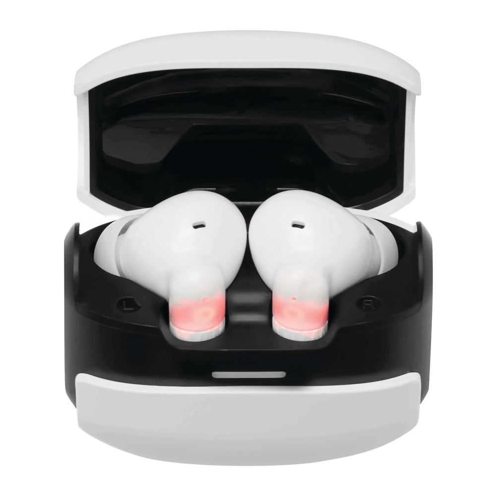 Bezdrátová sluchátka do uší s funkcí handsfree, kompatibilní s Bluetooth®, dosah cca 10 m, multifunkční tlačítko pro přijetí a ukončení hovoru a také tlačítko pro přehrávání/pauzu, další/předchozí skladbu a ovládání hlasitosti (nahoru/dolů), lze používat i samostatně, včetně nabíjecího kabelu USB s konektorem USB typu C (délka cca 20 cm), červená kontrolka nabíjení, úložné pouzdro sloužící zároveň jako nabíjecí stanice, kapacita sluchátek: 28 mAh, nabíjecí pouzdro: 150 mAh, baleno v dárkové krabičce. Rozměry: 5,3 x 4,8 x 3,2 cm