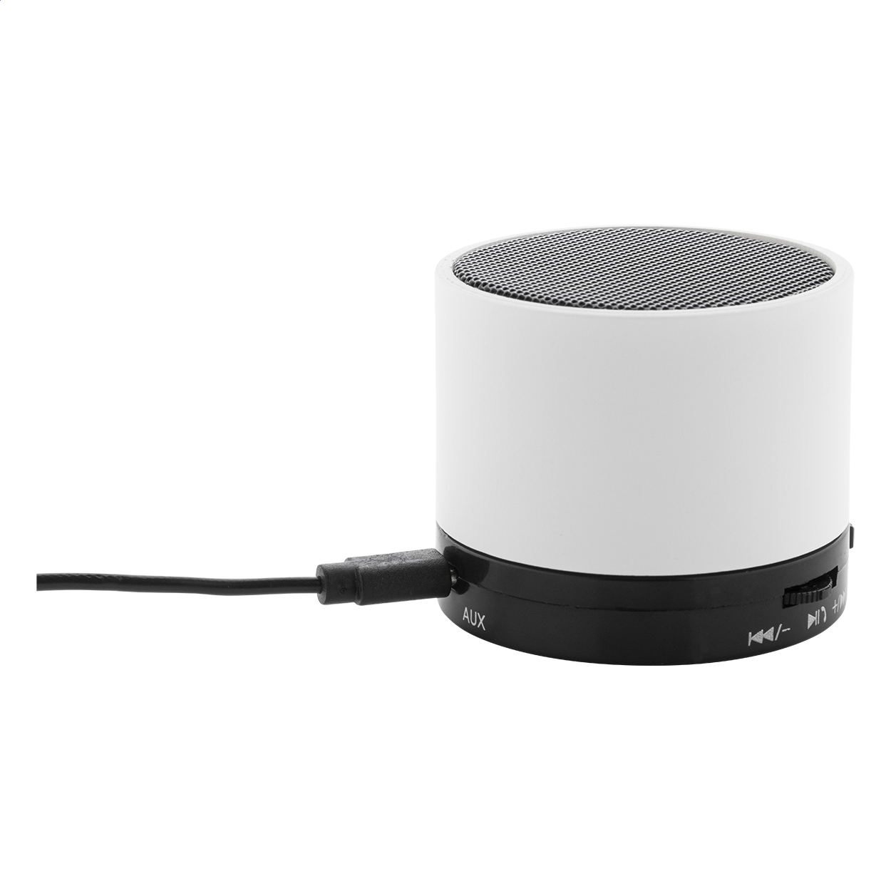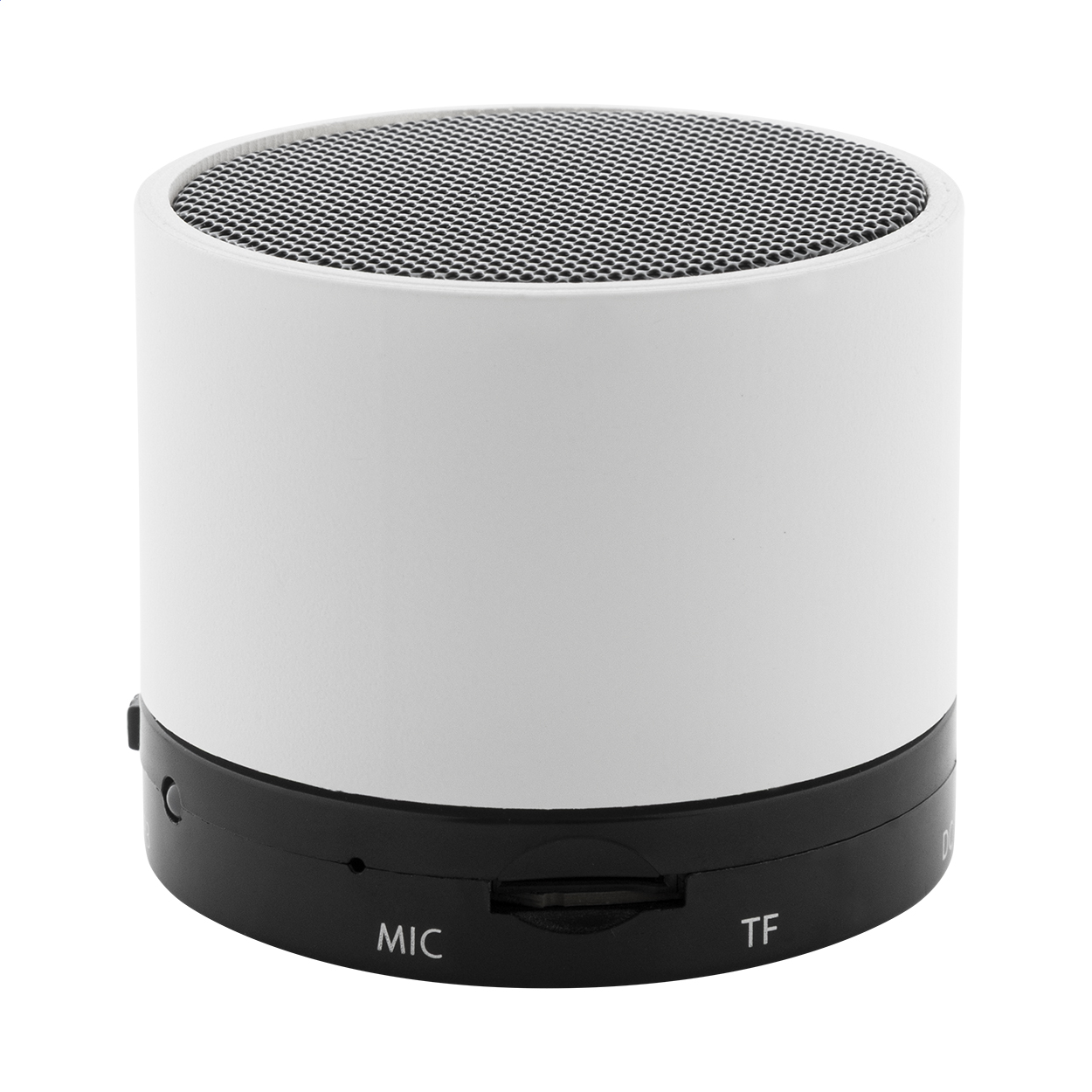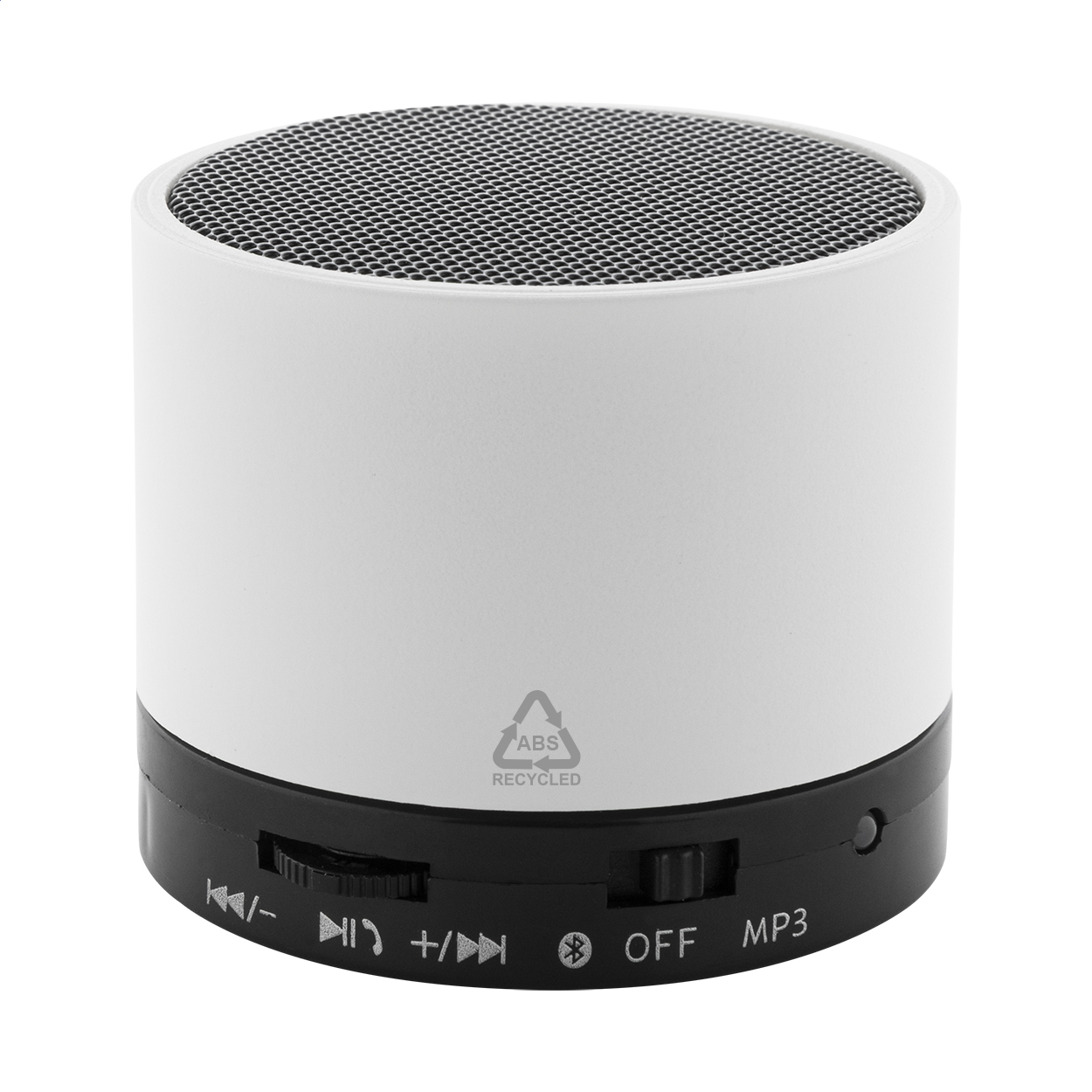 Bezdrátový reproduktor z recyklovaného ABS v pogumovaném pouzdře s kovovou síťovinou a dobíjecí baterií (300 mAh). S funkcí handsfree hovorů a přehrávání MP3 z micro SD karty. Včetně nabíjecího kabelu USB. Rozměry: o6×5 cm.