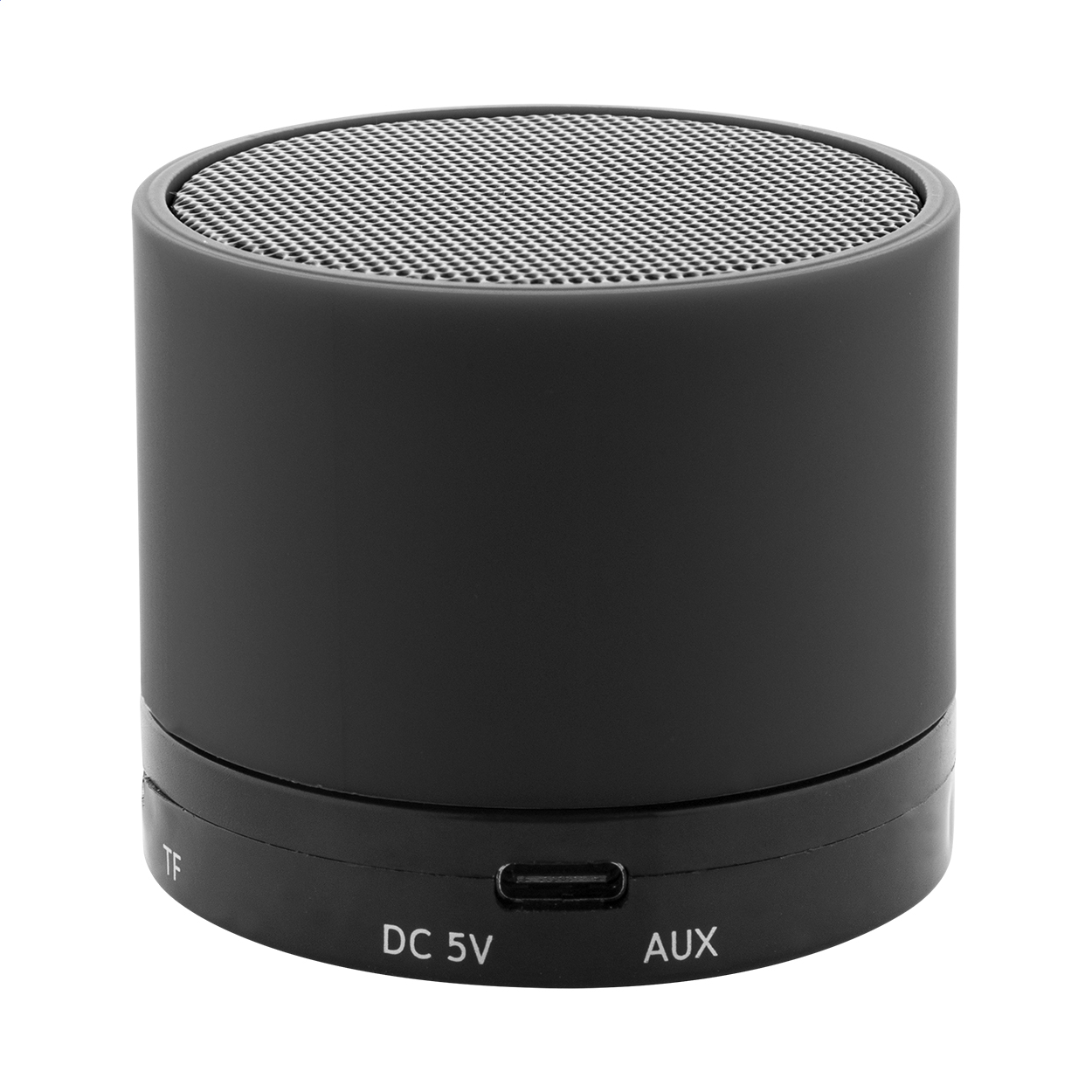 Bezdrátový reproduktor z recyklovaného ABS v pogumovaném pouzdře s kovovou síťovinou a dobíjecí baterií (300 mAh). S funkcí handsfree hovorů a přehrávání MP3 z micro SD karty. Včetně nabíjecího kabelu USB. Rozměry: o6×5 cm.