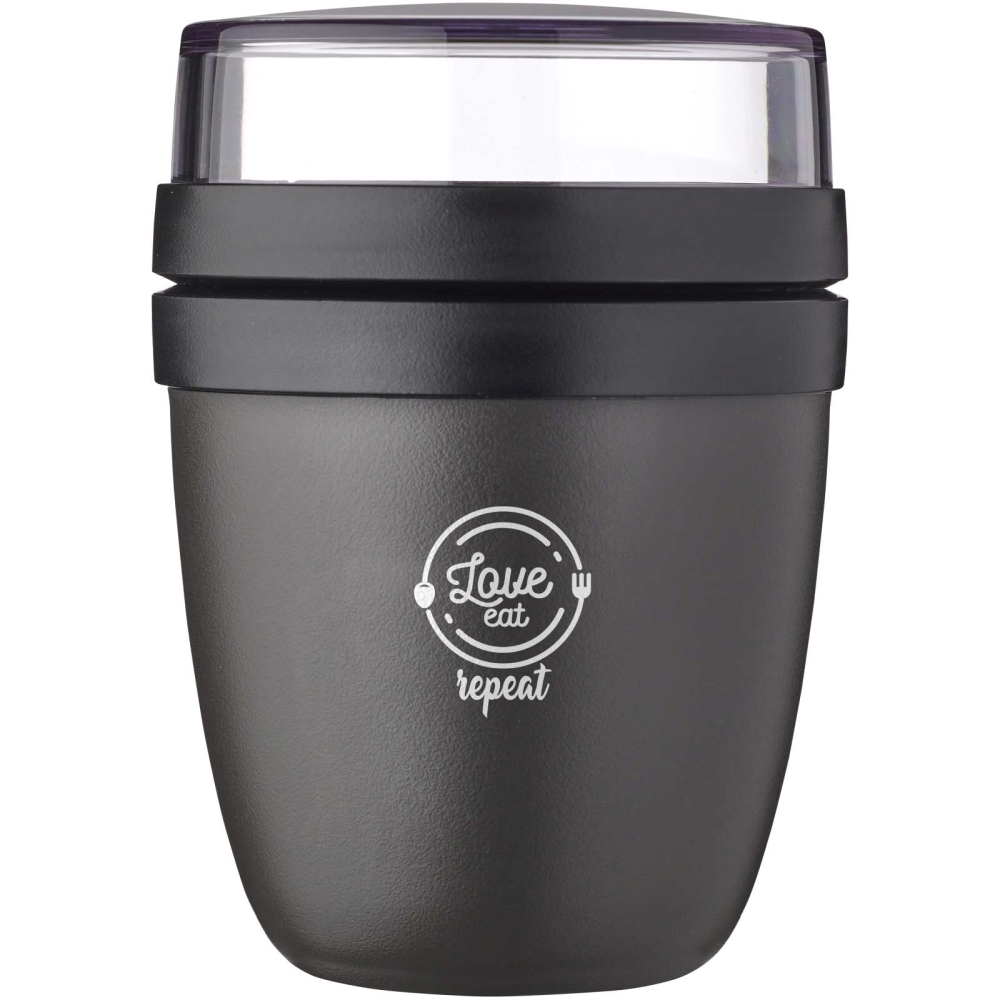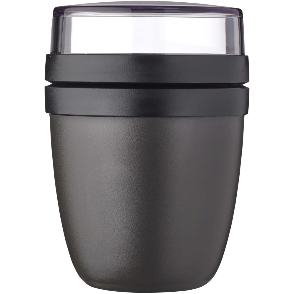 Ideální box na jídlo na různé svačiny, jako je jogurt s müsli nebo polévka s krutony. Díky dvěma praktickým přihrádkám v jedné pevné nádobě zůstanou vaše ingredience pěkně oddělené. Díky kompaktním rozměrům se snadno vejde do školní tašky a lze ho použít na rychlý a praktický oběd. Horní průhledná nádoba pojme 120 ml, což je ideální na přibližně 50 gramů müsli nebo ovoce, a spodní nádoba má objem 300 ml. Dobře těsní a je vhodná do myčky na nádobí. Neobsahuje BPA. Rozměry: 12,8 x O 9,1 cm