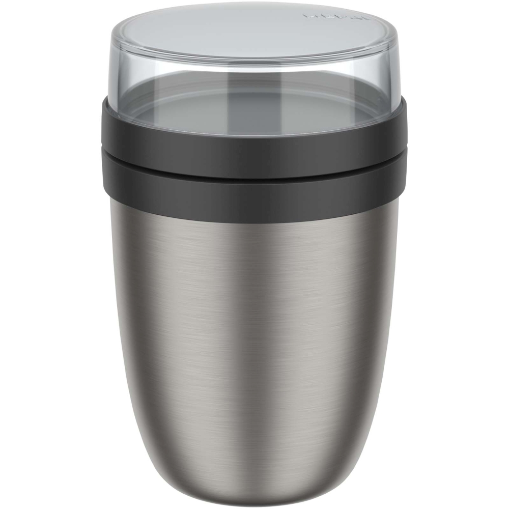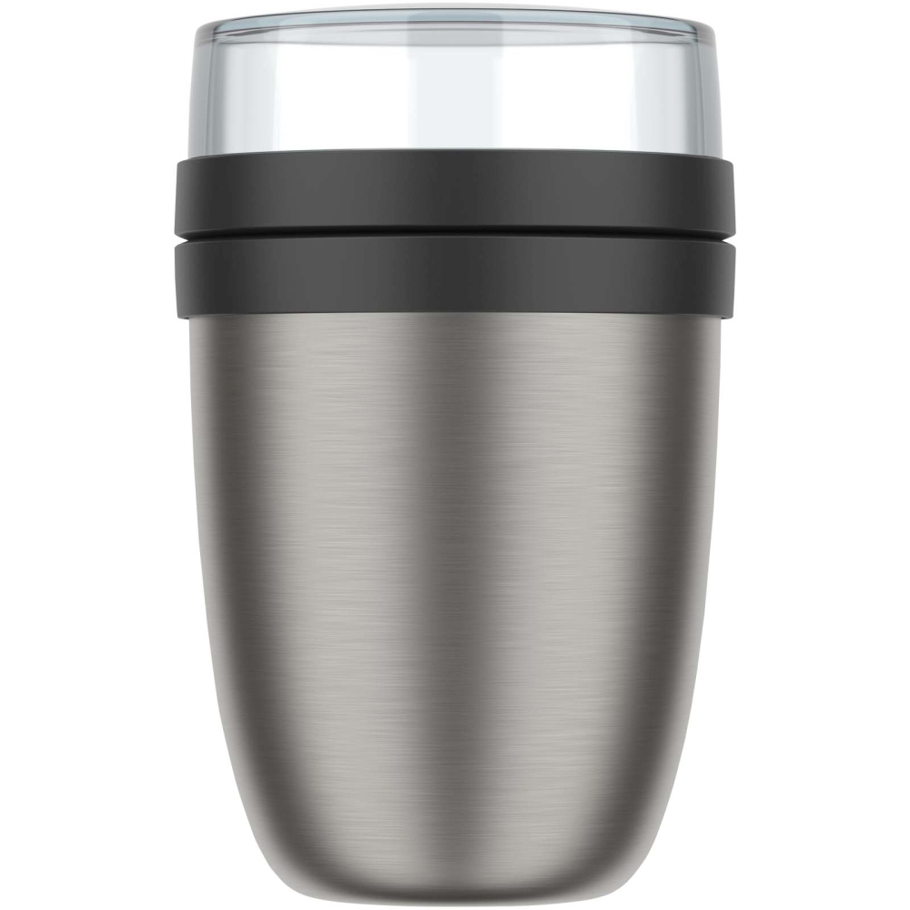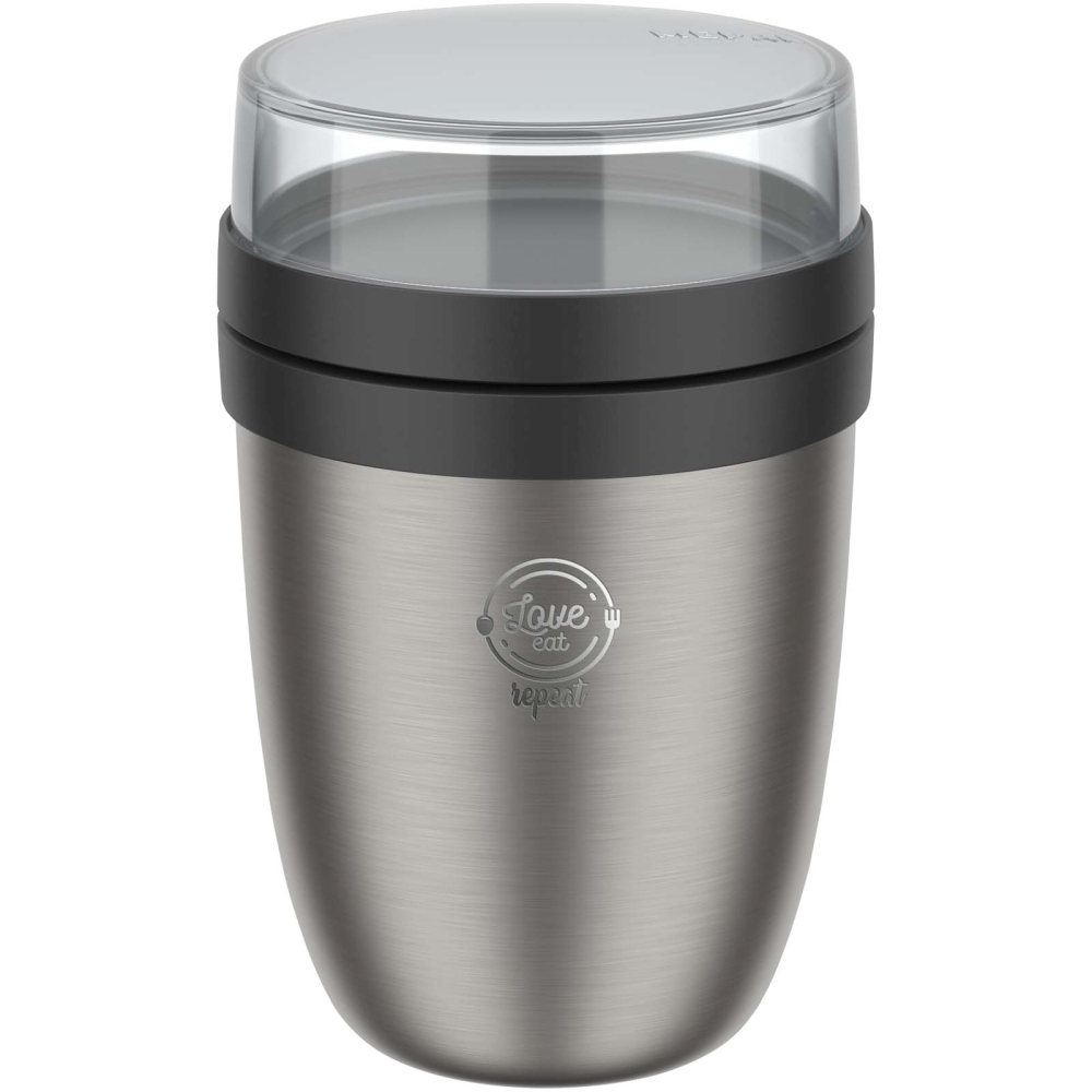 Tepelně izolovaný box na jídlo obsahující dvě různé přihrádky, díky kterým můžete uložit různé ingredience odděleně. Obě nádoby mají samostatné víko, aby se ingredience nesmíchaly. Udrží jídlo teplé 6–8 hodin a studené 12 hodin. Objem horní průhledné nádoby je 200 ml. Objem spodní nádoby je 500 ml. Vyrobeno z odolného materiálu. Vnější strana boxu zůstává chladná a suchá. Doporučujeme mýt ručně. Plastové části víka lze mýt v myčce na nádobí. Rozměry: 10,7 x 15,1 x 10,7 cm
