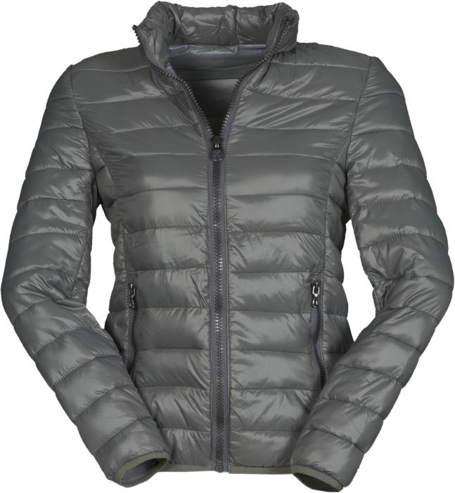 Dámská prošívaná bunda s šedou podšívkou, zapínání na zip, 2 vnitřní a 2 vnější kapsy, 100% nylon s lesklým efektem, uvnitř polyester - imitace peří. Kovové zipy s pogumovaným povrchem. Doporučená technologie tisku: sítotisk S3, výšivka.