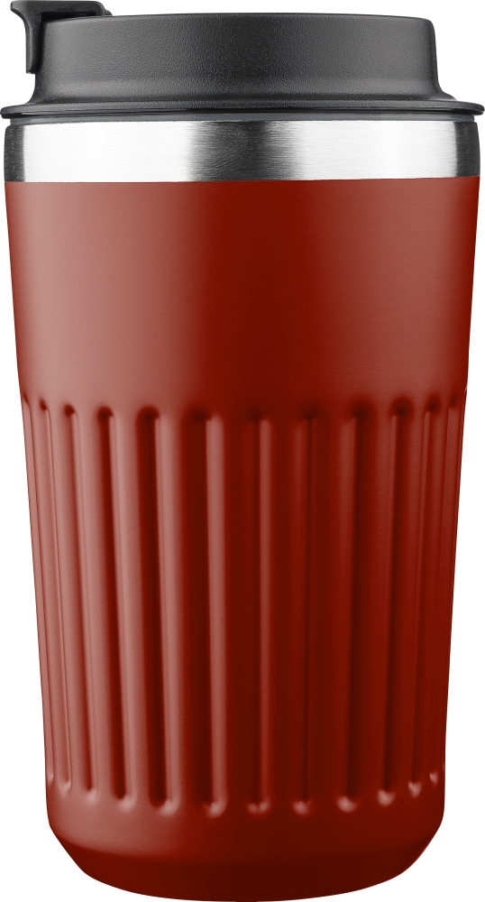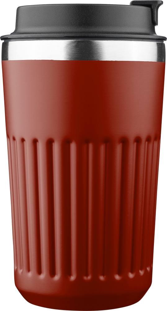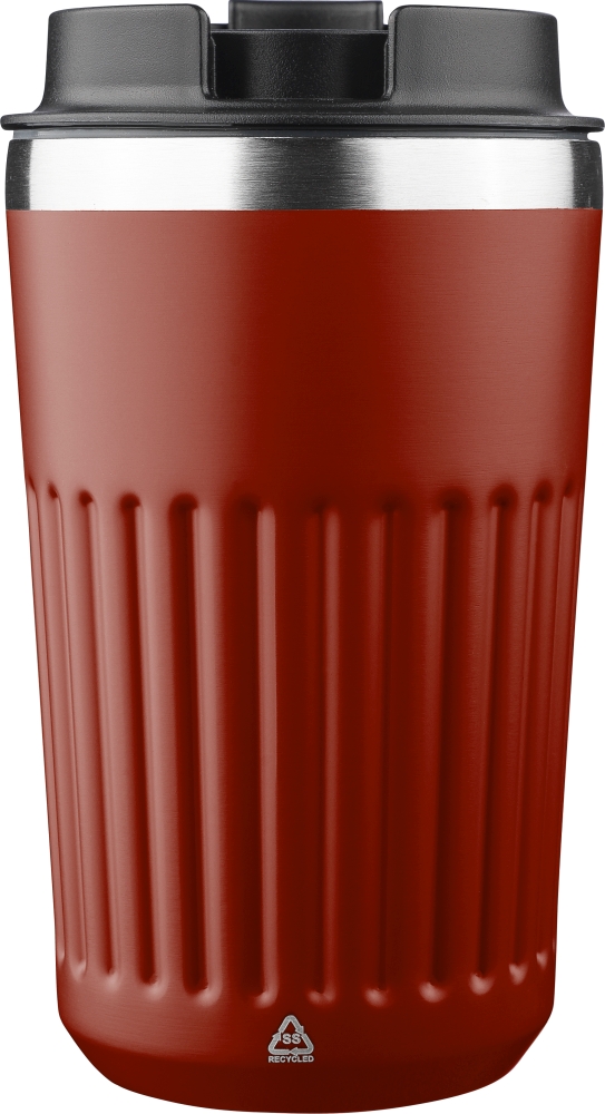 Cestovní hrnek z recyklované nerezové oceli (400 ml) s dvojitou stěnou a vnějšími výstupky. S víčkem z PP. Na těle je vyryté logo z recyklované oceli. Baleno v hnědé kartonové krabici. Rozměry: 8,7 cm x 15,6 cm