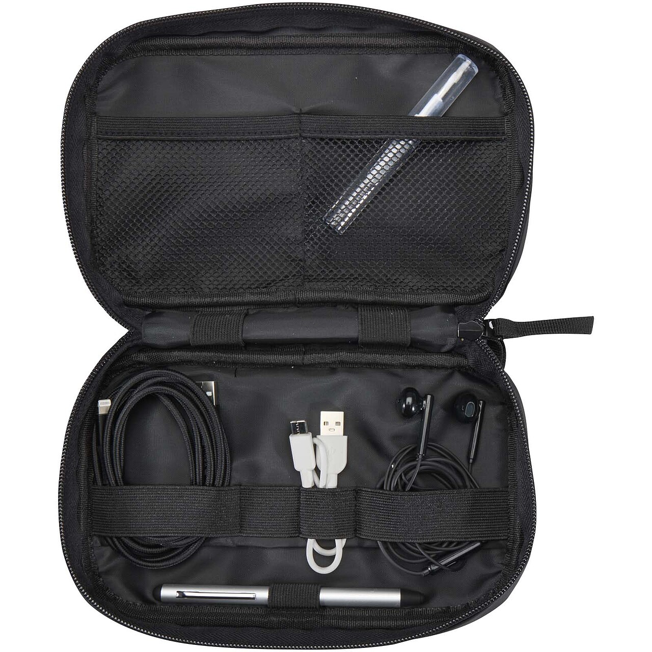 Tento organizér na kabely a elektroniku, vyrobený z recyklované PU kůže s certifikací GRS a sladěnou podšívkou z RPET, je určen pro cestovatele, pracující na dálku a technické nadšence. Je kompaktní a snadno se přenáší v batohu nebo příručním zavazadle. Má hlavní přihrádku na zip s praktickými organizačními prvky, včetně elastického poutka na pero, dvou síťovaných kapes na sluchátka a drobné příslušenství, zesílené přepážky a několika elastických poutek pro bezpečné uchycení kabelů, USB disků a nabíječek. Vnější část zahrnuje přední kapsu se zapínáním na suchý zip pro rychlý přístup a praktický popruh pro snazší přenášení. Díky voděodolné povrchové úpravě budete mít své nezbytnosti chráněné, ať už jdete kamkoli. Objemová kapacita: 1 litr. Rozměry: 21,5 x 13 x 5 cm