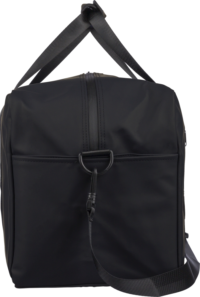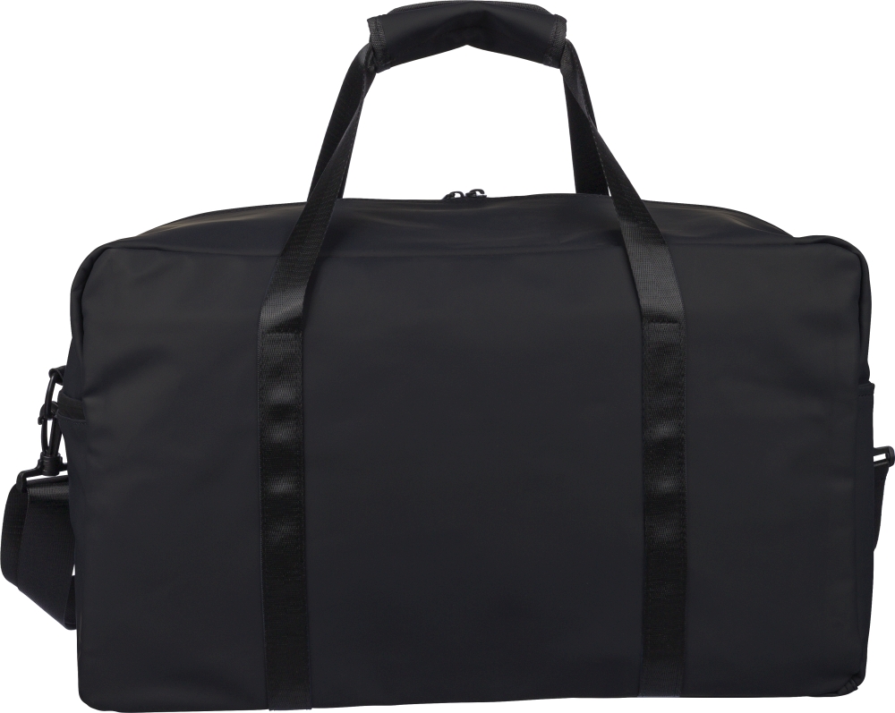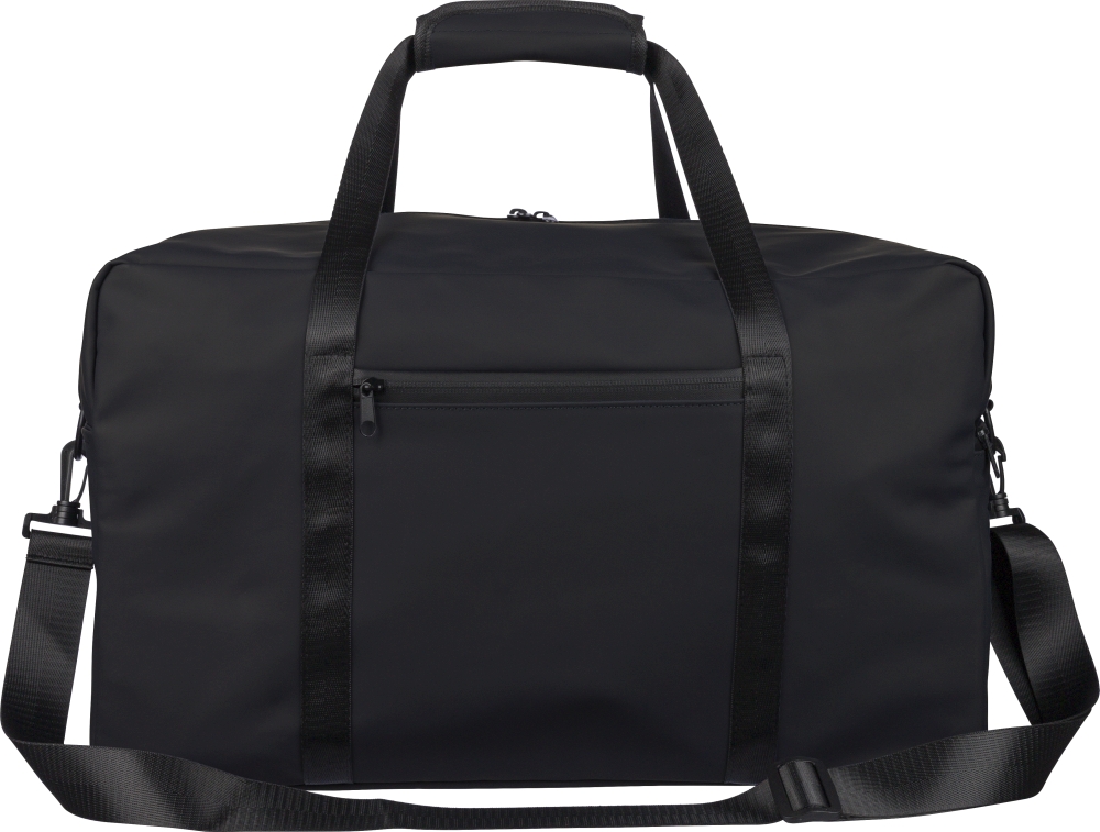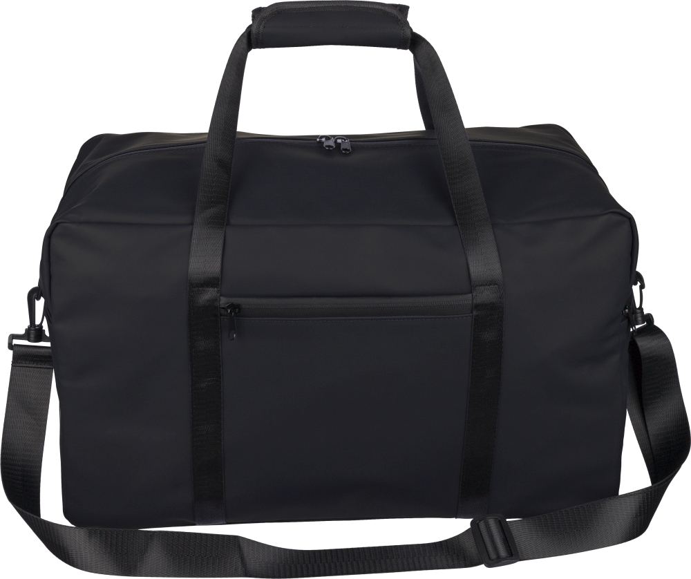 Recyklovaná PU cestovní taška (35 l) s podšívkou z recyklovaného polyesteru 210D. Má 108 cm dlouhá rukojeti (2,5 cm široká) se suchým zipem, 130 cm nastavitelný popruh (3,9 cm široký), přední kapsu na zip a velkou hlavní přihrádku. Recyklované logo uvnitř štítku. Rozměry: 29,5 cm x 49 cm