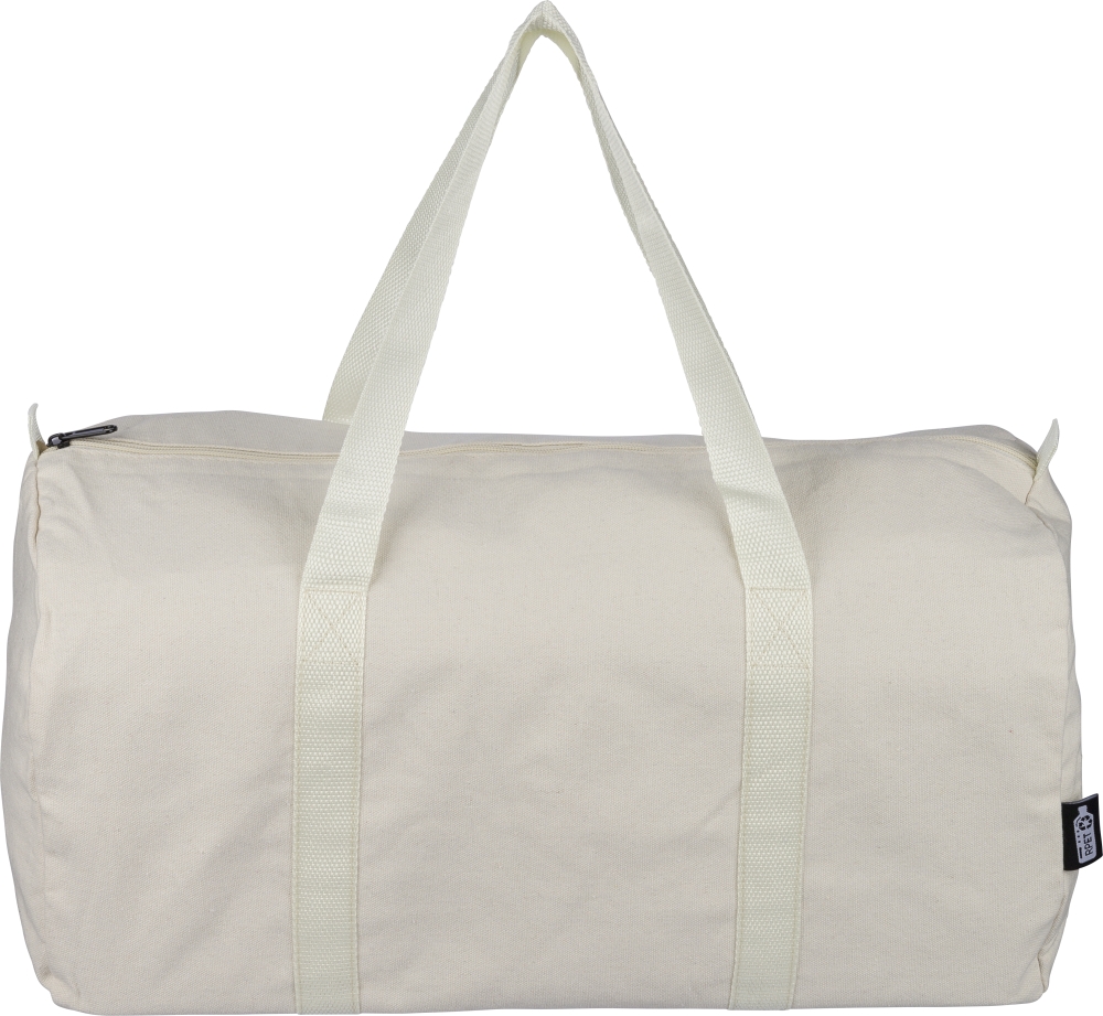 Cestovní taška z recyklované polybavlny (330 g/m2) s velkým horním oddílem na zip. S dlouhými rukojeťmi (délka 100 cm, šířka 3 cm) a odpovídajícím popruhem. Objem cca 30 litrů. Včetně štítku rPET na vnější straně a recyklovaného štítku uvnitř. Rozměry: 25 cm x 50 cm