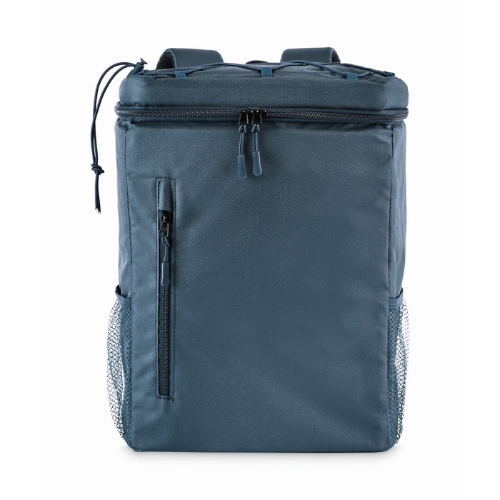 Chladicí batoh z polyesteru 600D RPET s polstrovanými nastavitelnými ramenními popruhy, podšívkou PEVA a 5 mm PE pěnou. Přední kapsa a dvě boční síťované kapsy. Objem: 9 l. Rozměry: 27.5 x 18 x 39 cm