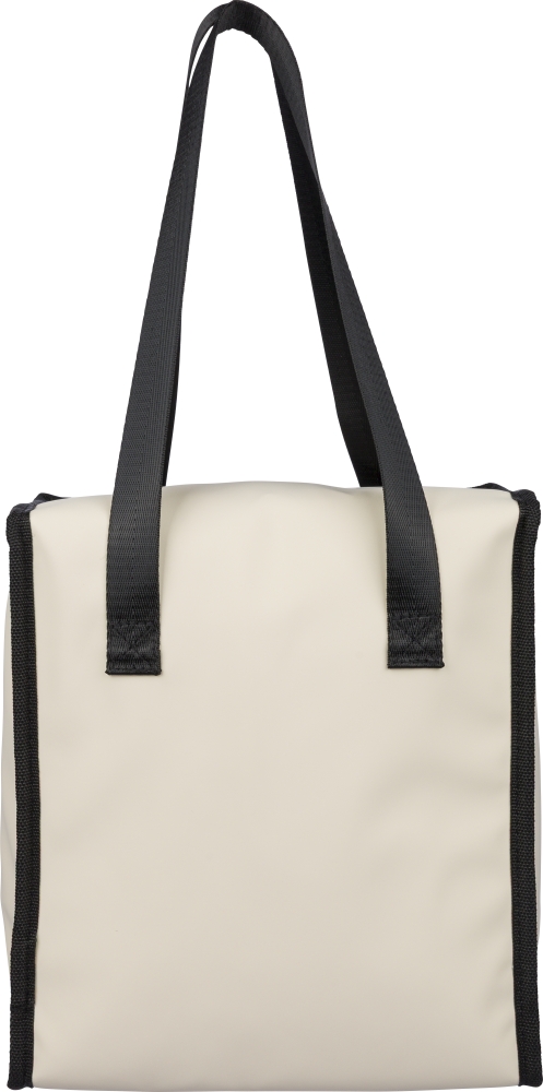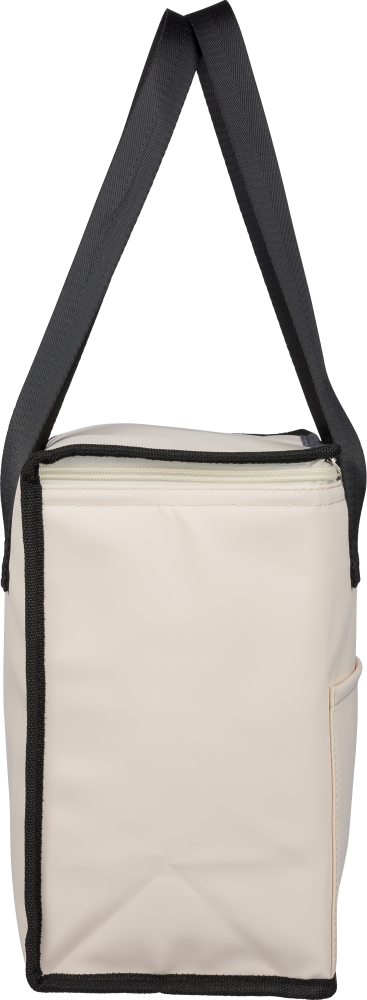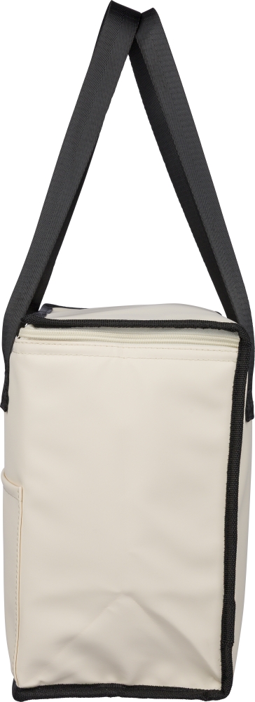 Chladicí taška z recyklovaného PU (objem 9 l) s podšívkou z recyklovaného polyesteru 210D. Má dlouhá ucha (2,5 × 66 cm) a přední kapsu pro další úložný prostor. Včetně malého recyklovaného loga uvnitř štítku. Rozměry: 26 cm x 23 cm