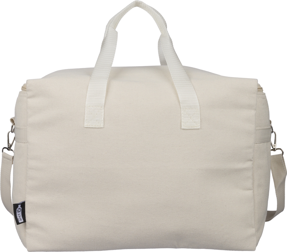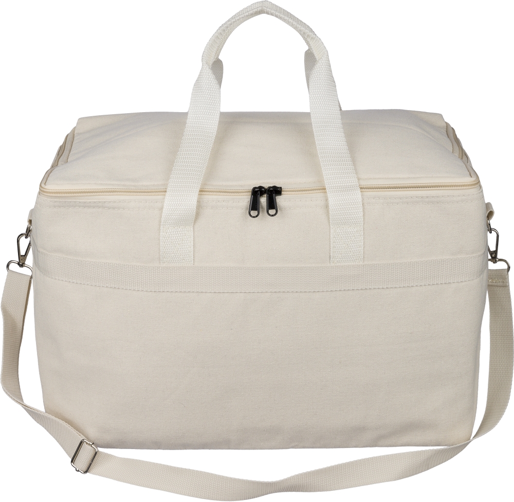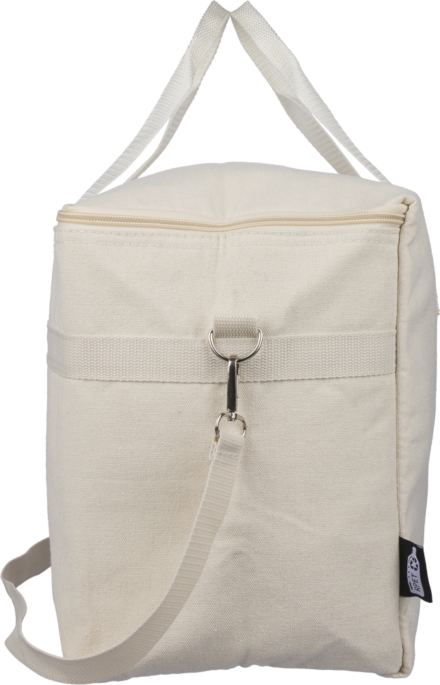 Chladicí taška z recyklované polybavlny (330 g/m2) s hliníkovou fólií. Objem 23 l. Rukojeti o délce 60 cm (šířka 3,5 cm), nastavitelný ramenní popruh o délce 110 cm (šířka 2,5 cm) s kovovou přezkou a odpovídající popruh. Součástí je vnější a vnitřní štítek z rPET. Rozměry: 21 cm x 39 cm