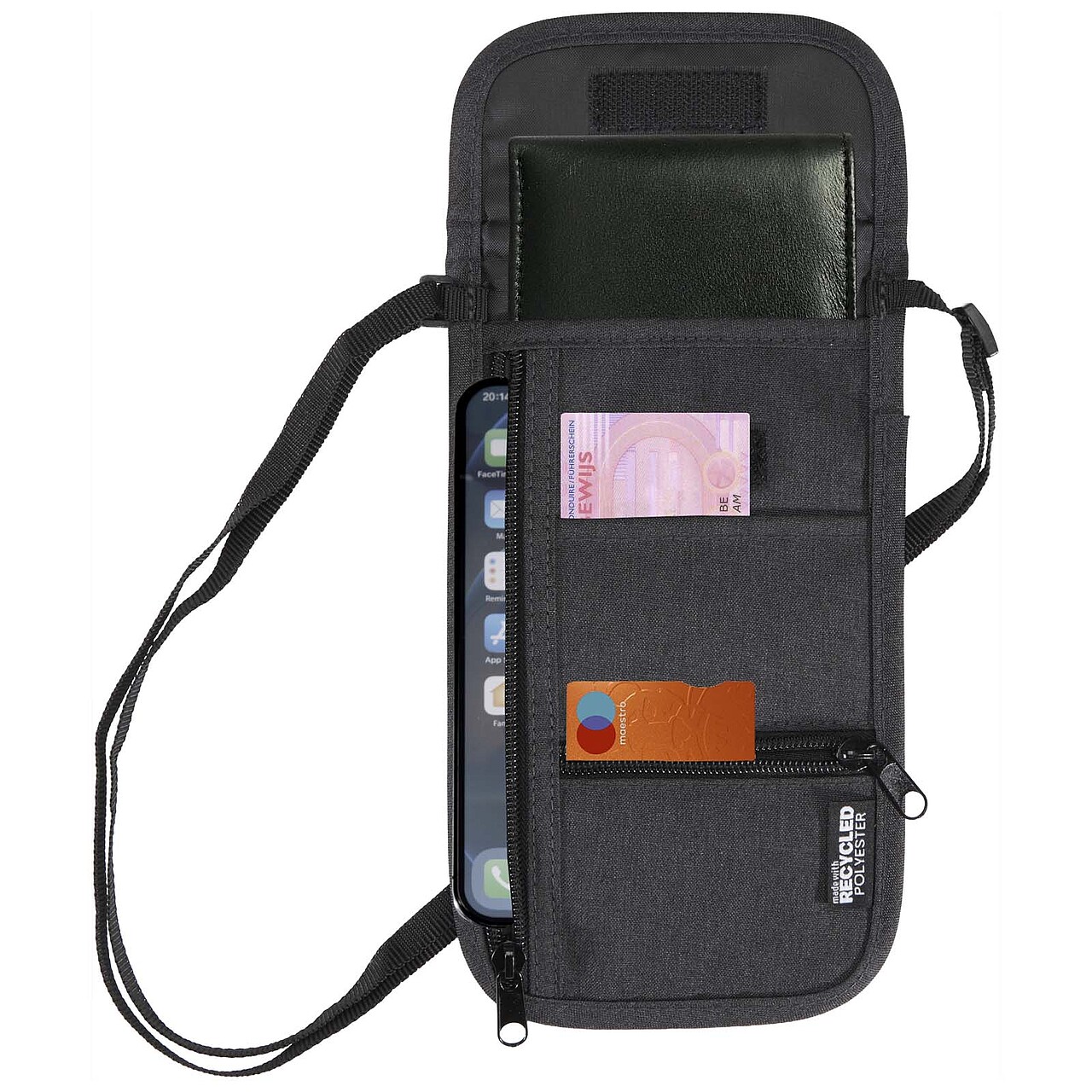 Chytré cestovní pouzdro je vyrobeno z recyklovaných materiálů s certifikací GRS a je navrženo tak, aby uchovávalo nezbytnosti na cestách v bezpečí a vždy po ruce. Je kompaktní, praktické a nabízí několik kapes na telefon, powerbanku, pas, karty, mince, kabely a další. Nastavitelný popruh až do délky 130 cm umožňuje pohodlné nošení, což z něj činí ideální cestovní doplněk pro moderní objevitele. Rozměry: 13 x 22 cm