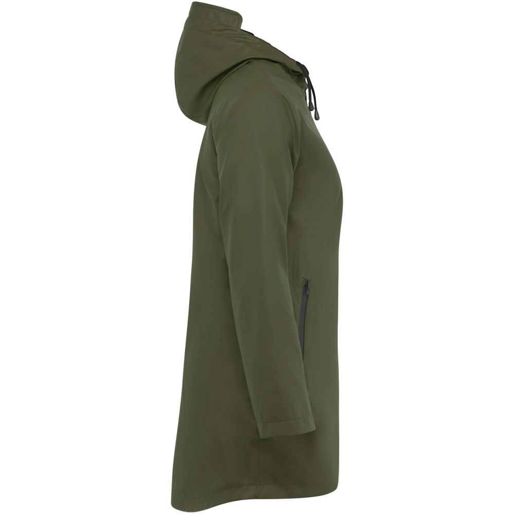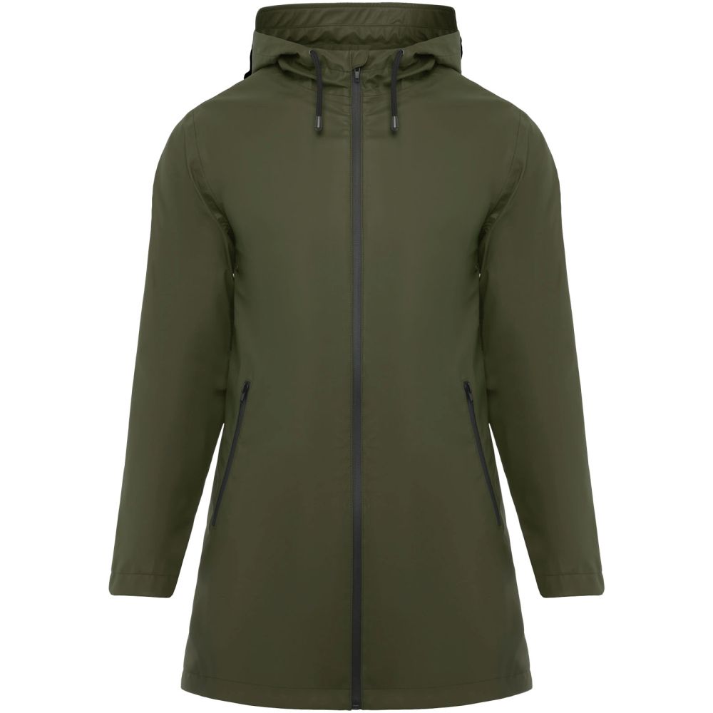 Nepromokavá pláštěnka. Kapuce s kšiltem. Zateplené zipy a švy. Kontrastní detaily v černé barvě. Dvě boční kapsy na zip. Rozparky na zadním lemu. Odnímatelný štítek. Nepromokavá. Modelka měří 185 cm a má na sobě velikost M.