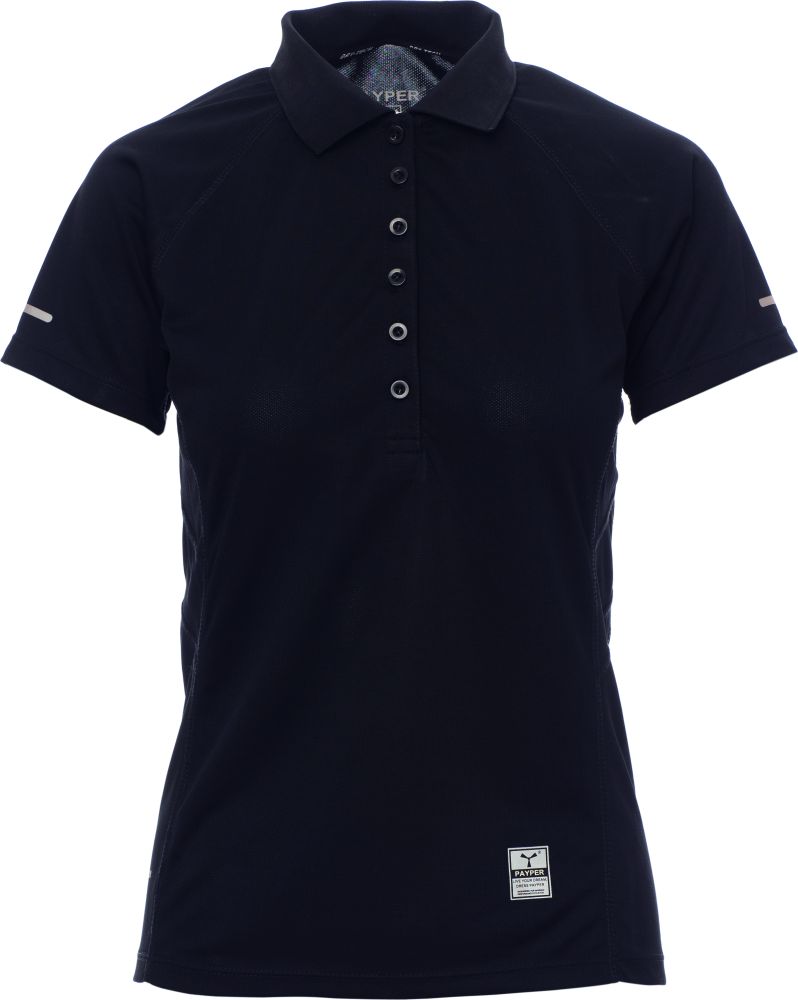 Dámská technicko-sportovní vyštíhlená polokošile s krátkým rukávem s 6 barevně sladěnými knoflíky, raglánové rukávy, dvojité postranní švy pro pohodlnější nošení, zúžený spodní okraj a prodloužená zadní strana, reflexní vložky na rukávech a na spodní straně límečku, kontrastní páska kolem krku, nažehlovací etiketa.