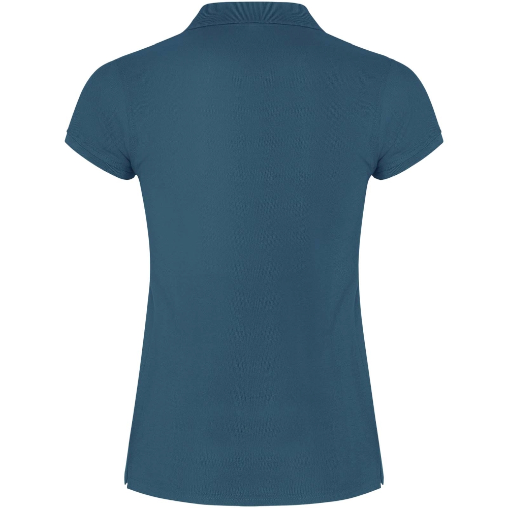 Dámské polo tričko s krátkým rukávem. Zesílené kryté švy ve vnitřním límci. Límec a manžety s žebrováním 1x1. Boční švy a vypasovaný střih. Úzké zapínání na 3 knoflíky. Boční rozparky. Odnímatelná etiketa.