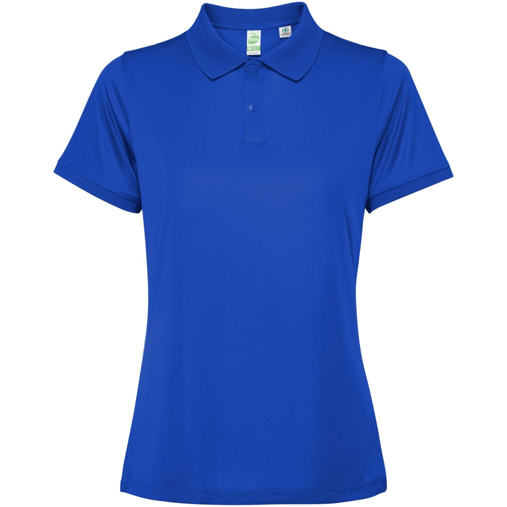 Dámské vypasované polo tričko s krátkým rukávem. Zesílené kryté švy ve vnitřním límci. 1×1 žebrované manžety a límeček. Boční švy. Zapínání na 3 knoflíky a boční rozparky.
