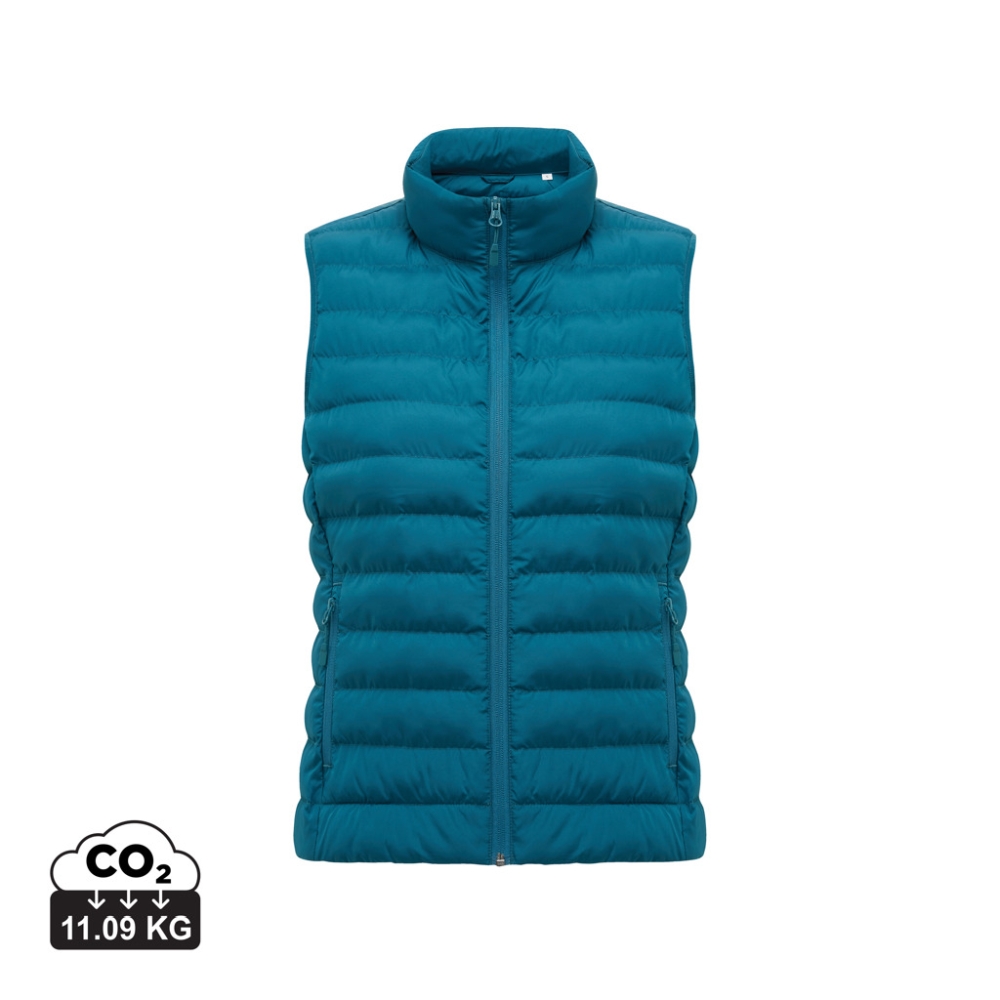 Dámská medium fit vesta vyrobená ze 100 % recyklovaného polyesteru. Perlová výplň ze 100 % recyklovaného polyesteru. Oboustranný zip na přední straně, kapsy na zip po stranách. Tahače zipů v ladících odstínech. Průramky s elastickým lemováním s kompletně čistými švy. Vodě repelentní impregnace bez obsahu fluorinu/PFAS.Rozměry: 64 x 56 x 0.5 cm