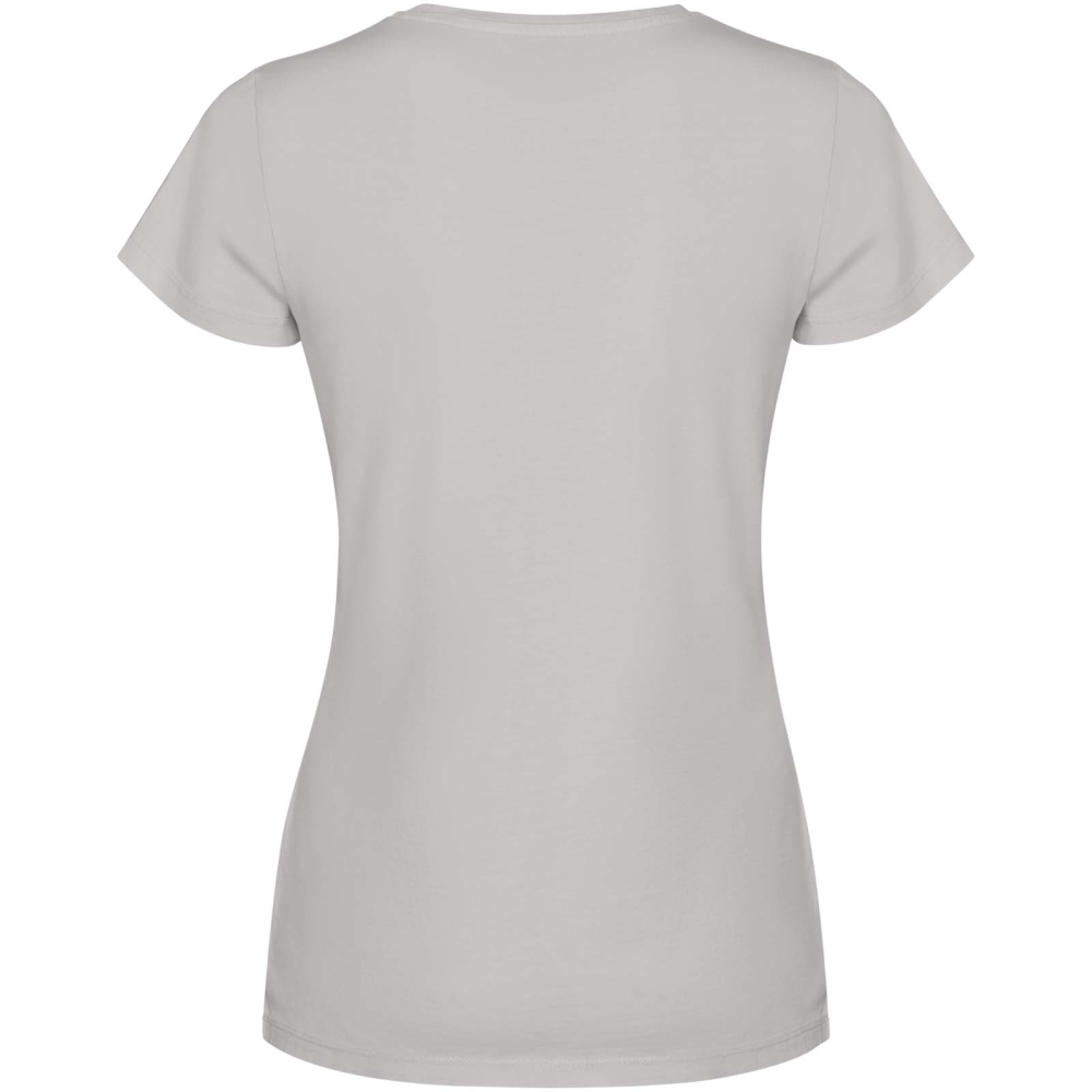 Dámské tričko s krátkým rukávem. Sepraný vzhled. Žebrovaný kulatý výstřih 1 × 1 a boční švy. Krycí steh v tónu látky u krku.