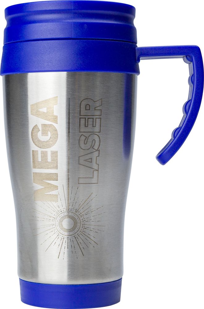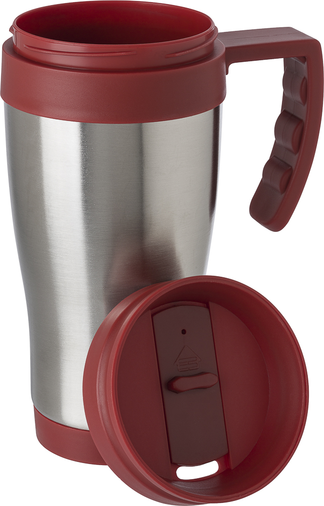 Cestovní plastový dvoustěnný termohrnek o objemu 400 ml s nerezovou vnější stranou. Rozměry: o 8 × 18,2 cm.