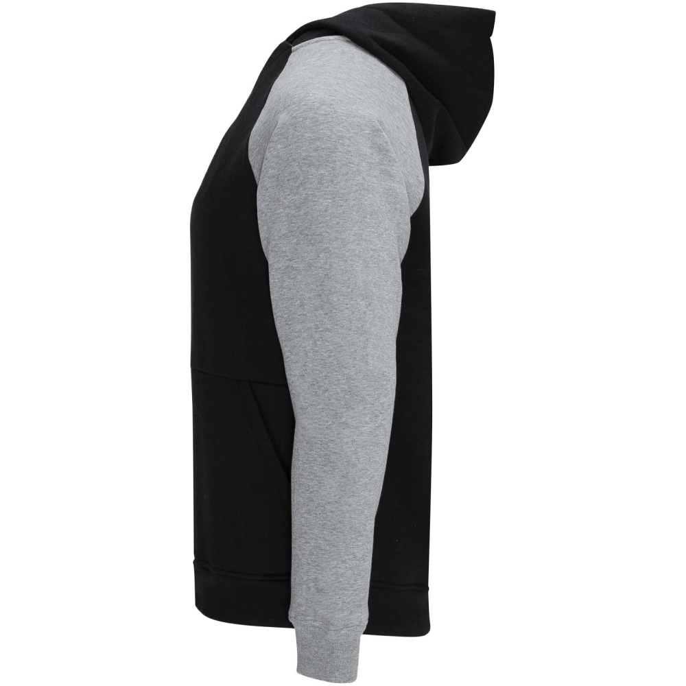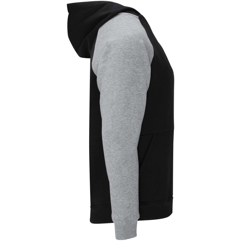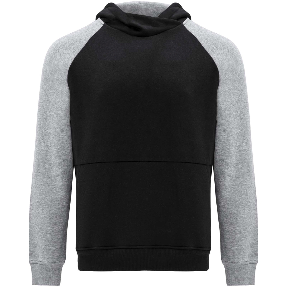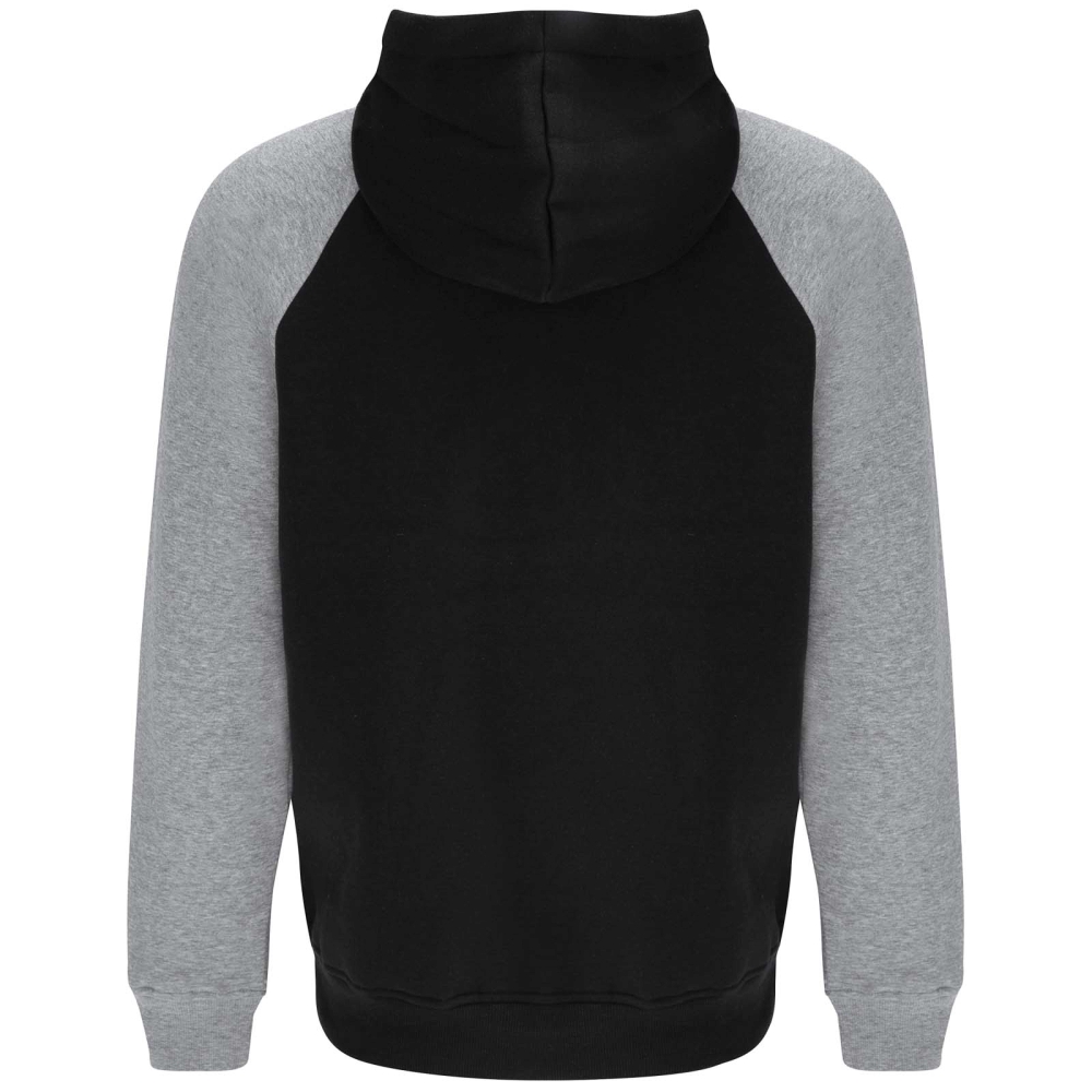 Dvoubarevná unisex mikina s kapucí. Kapuce se zkříženým límcem a kovovými očky. Kontrastní vnitřní kapuce, stahovací šňůrka a raglánové rukávy. Klokaní kapsa. Manžety a lem z elastanového žebrového úpletu 1 × 1. Odnímatelný štítek.