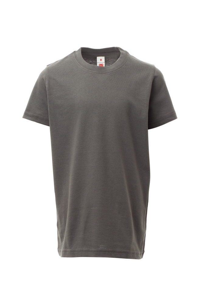Dětské tričko s krátkým rukávem a kulatým výstřihem, 1,5 cm pružný žebrovaný lem ze směsi spandex u krku s vrchním prošíváním na přední straně, tubulární střih.