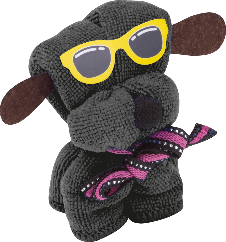 Měkký hadřík z mikrovlákna (20 x 20 cm) složený do tvaru psa a zabalená. Rozměry: 6 x 5,5 x 8 cm