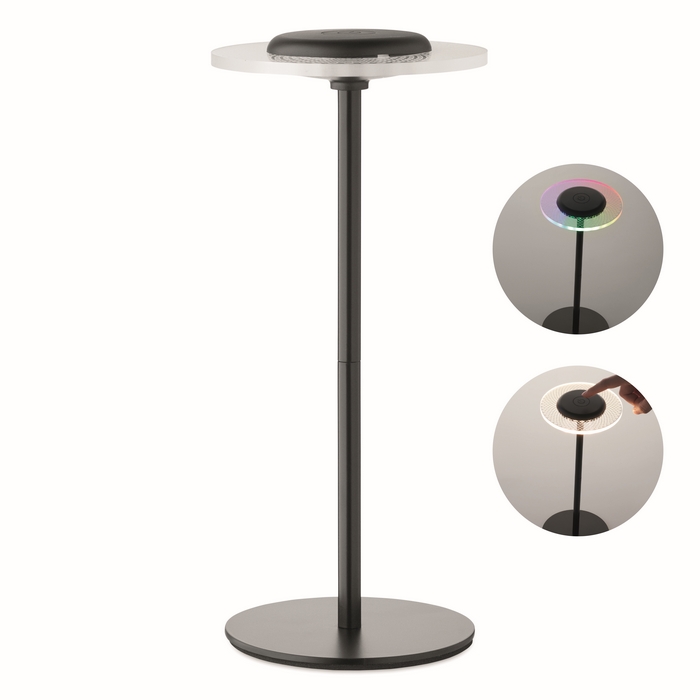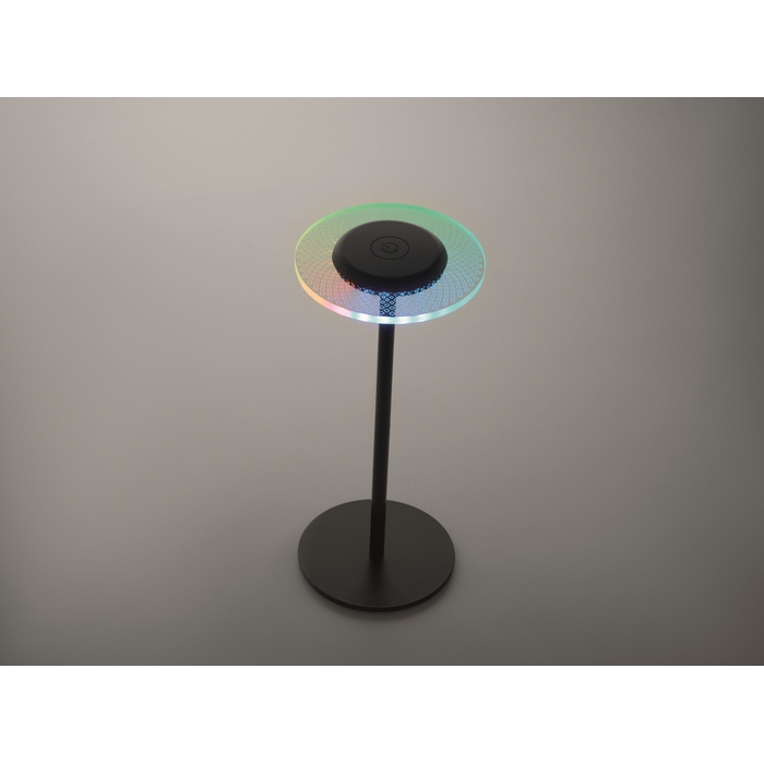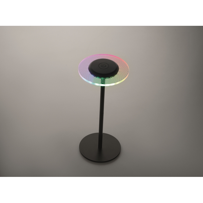 Dobíjecí kovová stolní lampa se 39 RGB světly LED a plynulým stmíváním. S možností teplého nebo barevně se měnícího světla. Vestavěná baterie s kapacitou 2000 mAh vydrží svítit až 6 hodin. Rozměry: O13 x 29.5 cm