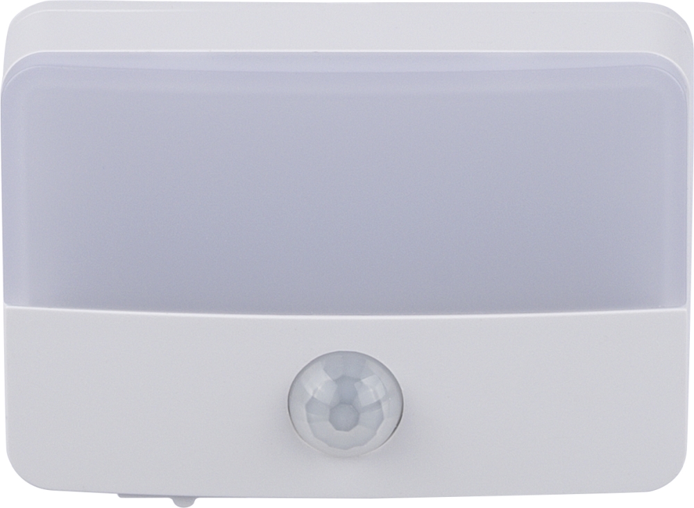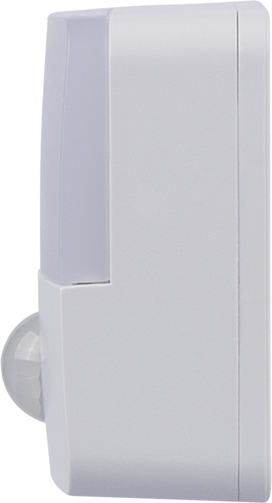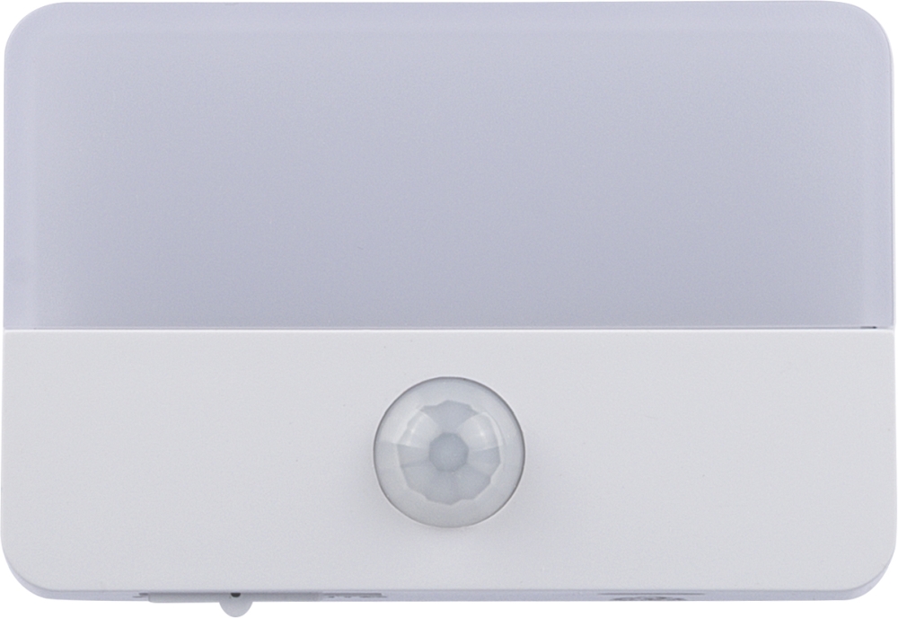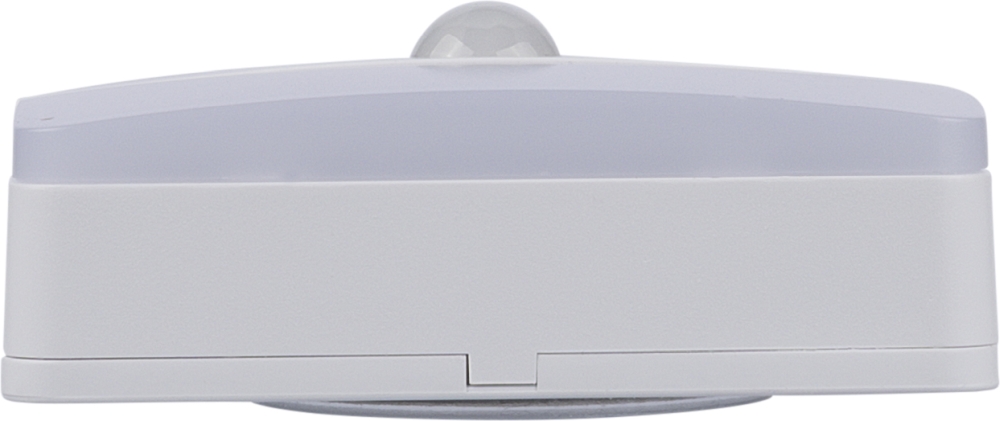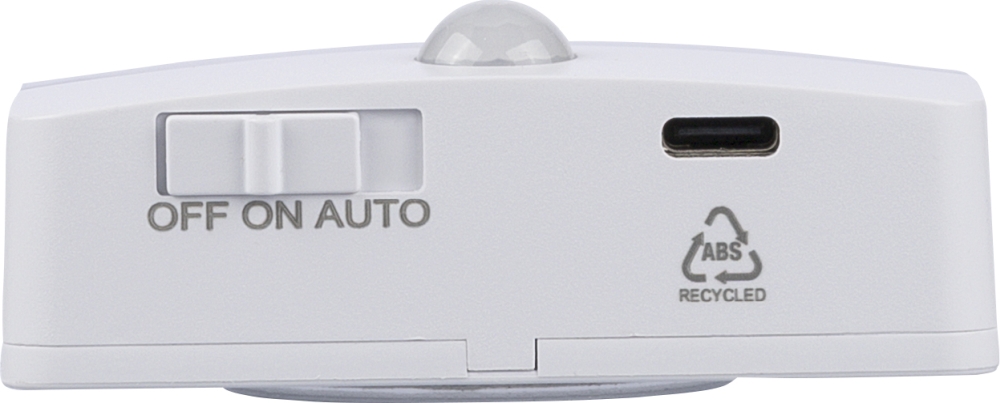 Senzorové světlo z recyklovaného ABS a PC s výkonem 30 lm, detekcí pohybu 120° (dosah 3–6 m) a senzorem denního světla. Nabíjecí přes USB-C (baterie 500 mAh). Zadní strana má magnet, kovovou destičku s lepidlem a otvor pro zavěšení. Logo z recyklovaného ABS pod nabíjecím portem. Baleno v hnědé kartonové krabici s ilustrací. Rozměry: 5,1 cm x 7,6 cm