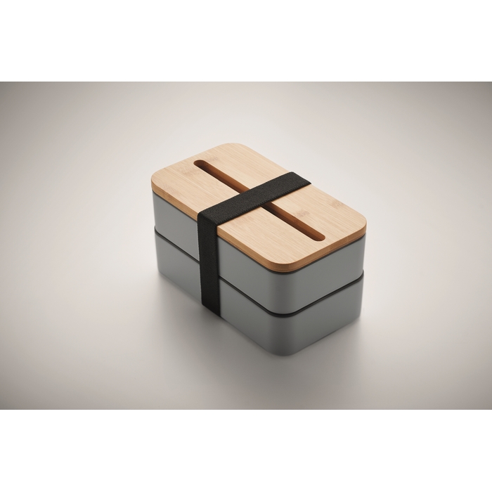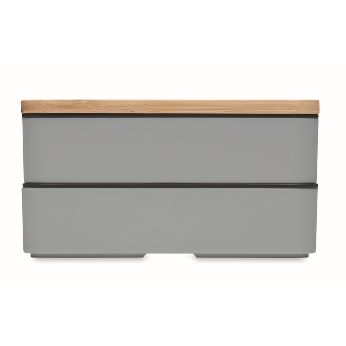 Dvoupatrový box na svačinu z PP s odnímatelnou přepážkou a 3 příbory. Zavírání pomocí pásky. Bambusové víko slouží i jako stojánek na telefon. Objem: 400 ml (2x). Bambus je přírodní materiál, může dojít k mírným změnám barvy, dekorace a velikosti. Neteče. Rozměry: 18 x 10 x 9,5 cm