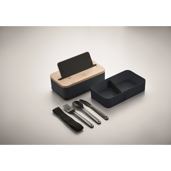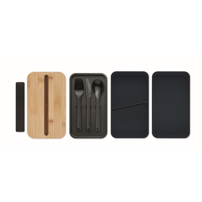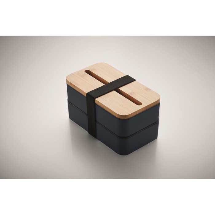 Dvoupatrový box na svačinu z PP s odnímatelnou přepážkou a 3 příbory. Zavírání pomocí pásky. Bambusové víko slouží i jako stojánek na telefon. Objem: 400 ml (2x). Bambus je přírodní materiál, může dojít k mírným změnám barvy, dekorace a velikosti. Neteče. Rozměry: 18 x 10 x 9,5 cm