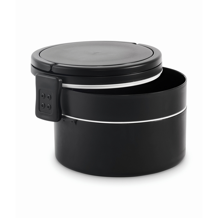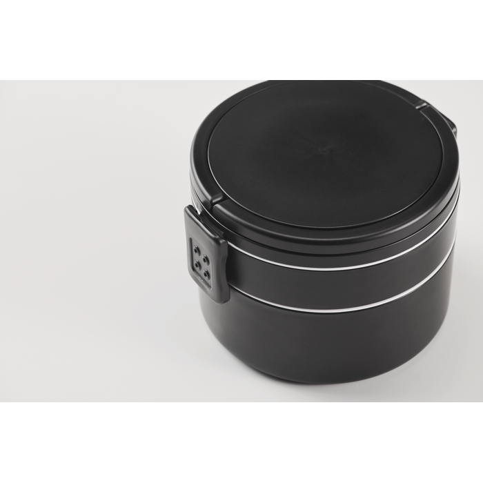 Dvoupatrový kulatý box na oběd nebo svačinu z PP s bočním zavíráním pomocí klipů. Včetně vnitřních vložek. Objem 250 ml (horní) a 700 ml (dolní). Rozměry: 16.5 x 14.5 x 11.3 cm