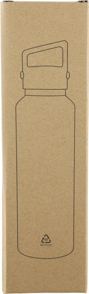 Vakuová láhev z recyklované nerezové oceli (600 ml) s dvojitou stěnou, PP víčkem s poutkem na nošení, dvojitým otevíráním víčka tlačítkem a laserem gravírovaným recyklovaným logem. Baleno v hnědé kartonové krabici. Rozměry: 7,4 cm x 27 cm
