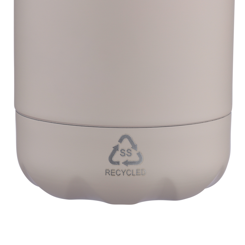 Láhev na pití z recyklované nerezové oceli s objemem 500 ml a dvojitou stěnou pro udržení teplých nebo studených nápojů až 12 hodin. Vnitřní plášť z nerezové oceli zajišťuje vynikající odolnost, odolnost proti korozi a bezpečný kontakt s potravinami a nápoji. Povrchová úprava v hladkém matném odstínu. Šroubovací víčko a dno jsou sladěny v barvě pro čistý a jednotný vzhled. Na přední straně těla je vyryté recyklované logo. Baleno jednotlivě v hnědé kartonové krabici. Rozměry: 7 x 26 cm