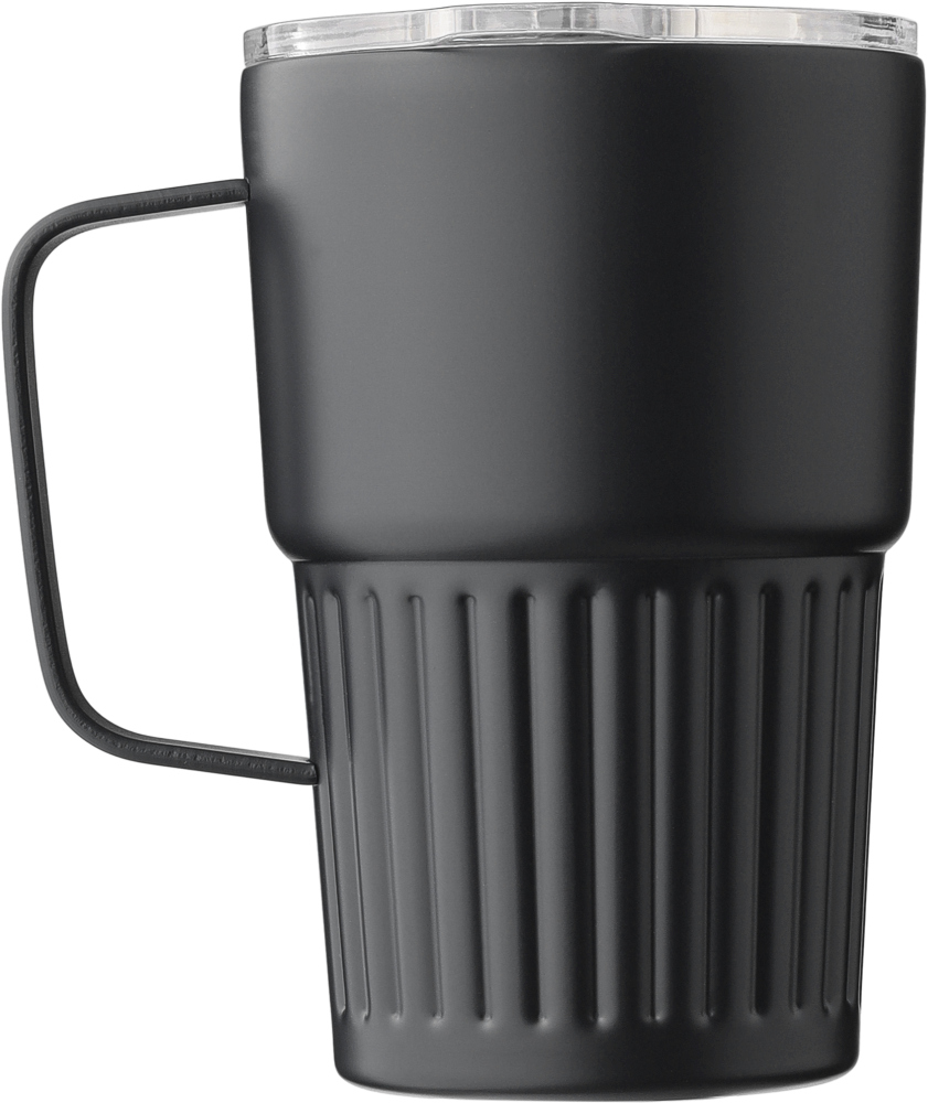 Dvoustěnný hrnek z recyklované nerezové oceli (450 ml). S vroubkovanou robustní rukojetí. S víkem AS s posuvným uzávěrem. Na těle je vyryté recyklované logo. Jednotlivě baleno v hnědé kartonové krabici. Rozměry: 8,7 x 14 cm