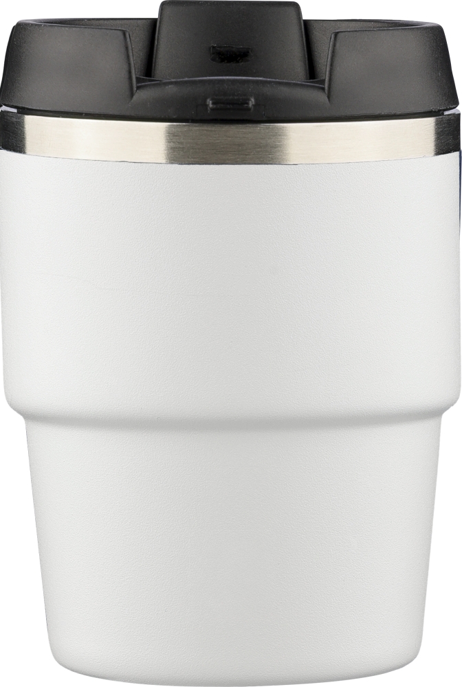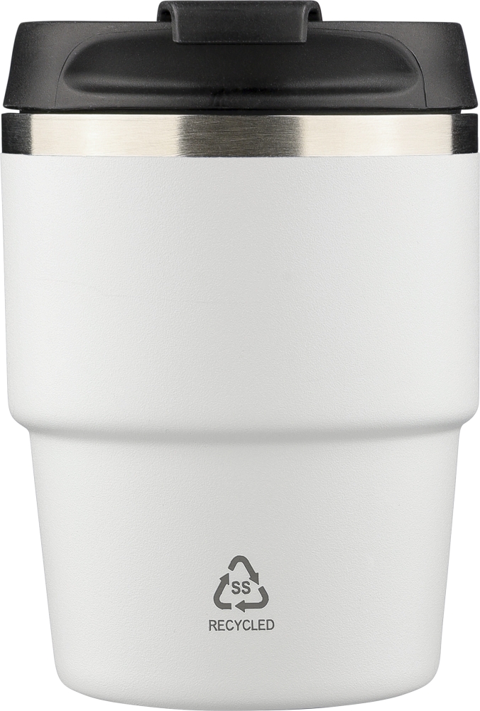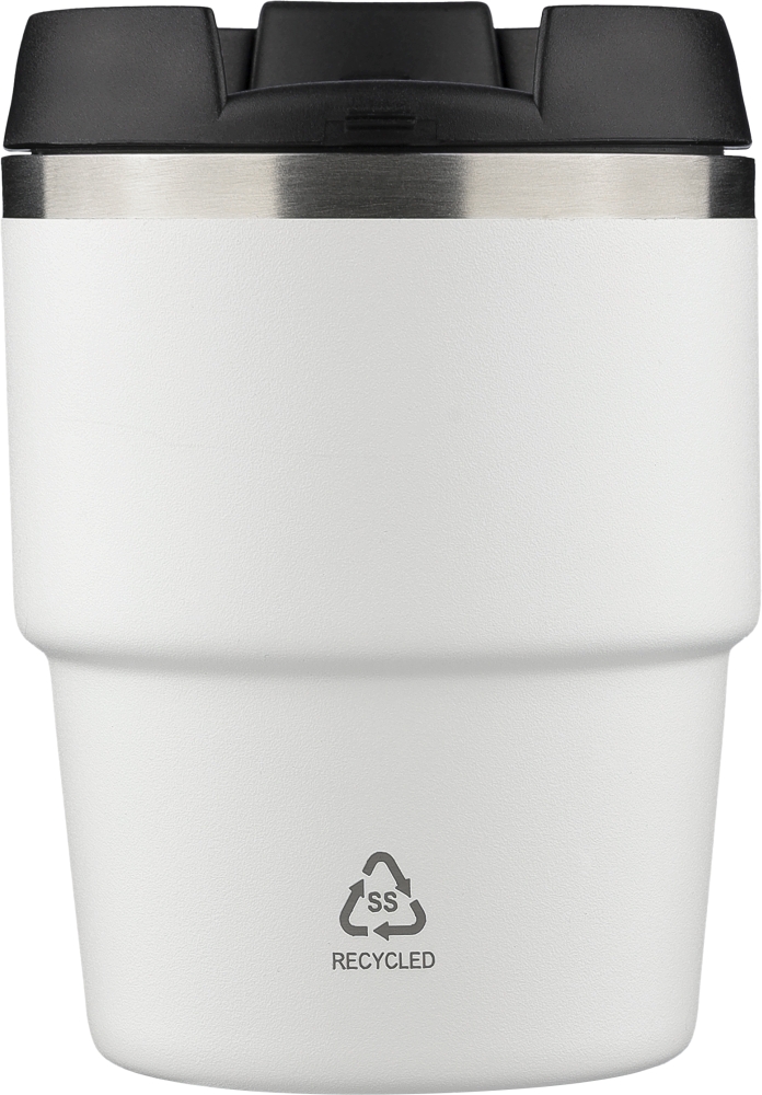 Vakuový hrnek z recyklované nerezové oceli (175 ml) s dvojitou stěnou, práškovým lakováním, šroubovacím víčkem z PP a laserově gravírovaným recyklovaným logem. Kompaktní design vhodný pro většinu kávovarů. Baleno v hnědé kartonové krabici. Rozměry: 10 cm x 7,5 cm